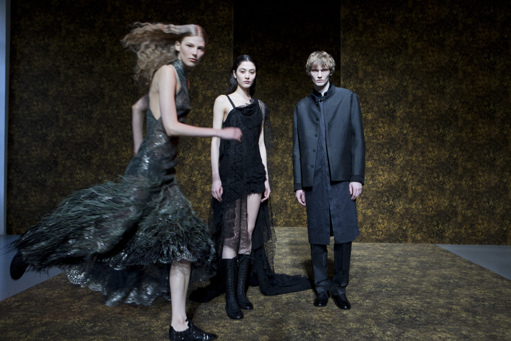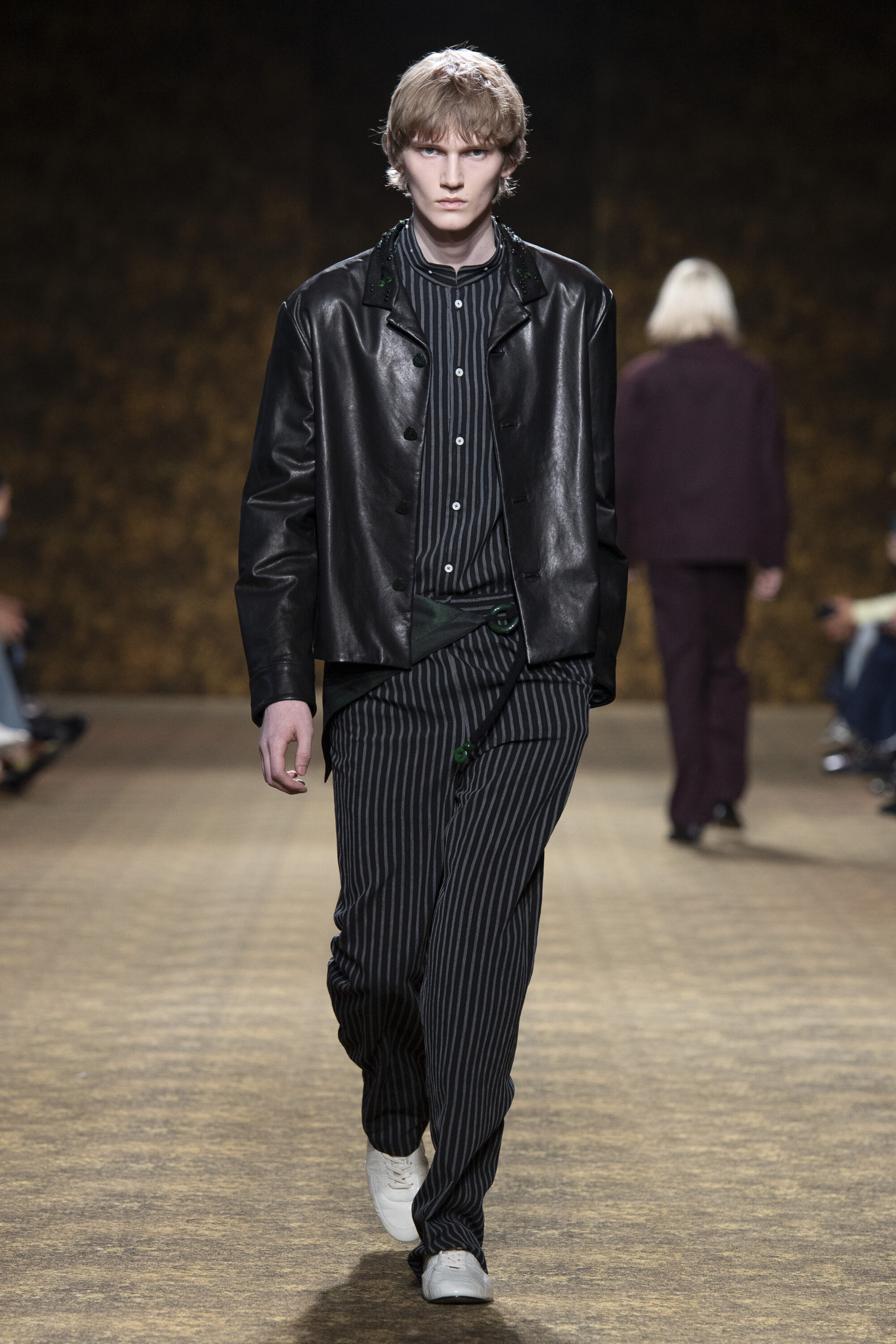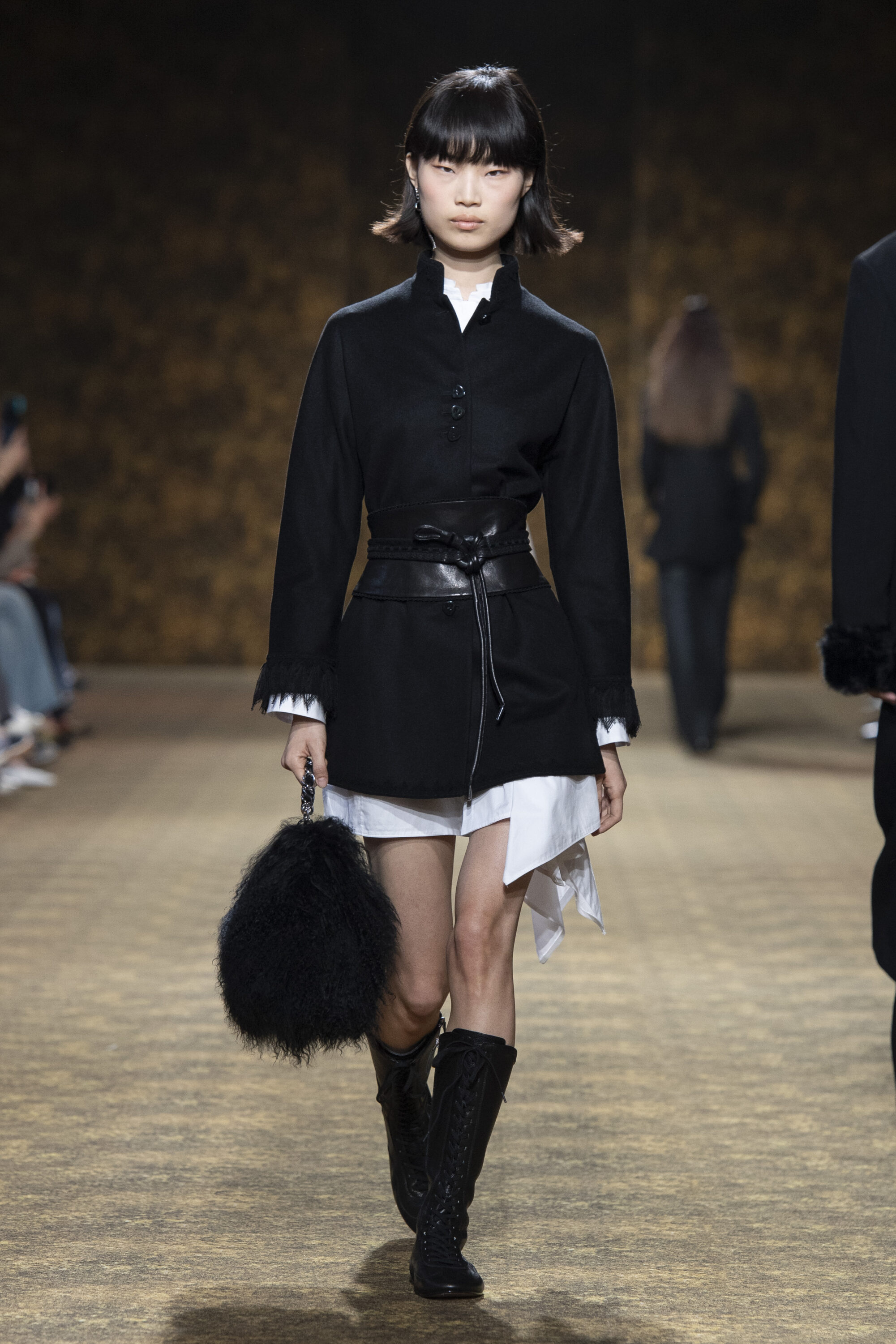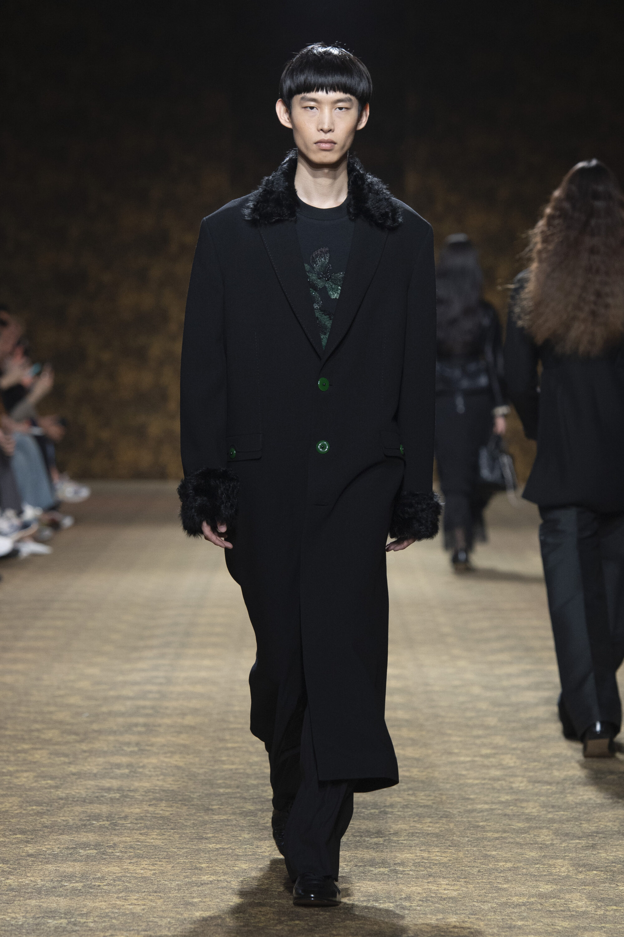 男裝延續盛世的飽和能量,透過陰刻刺繡與仿舊處理讓時間在布料留下痕跡。其中西裝外繫腰封、方形連袖與中式鑲邊口袋,構築剛勁而內斂的細節,細小玉石裝飾與毛料點綴領口袖口,營造如壁畫般的質地,在歷史感與當代剪裁間取得精準平衡。