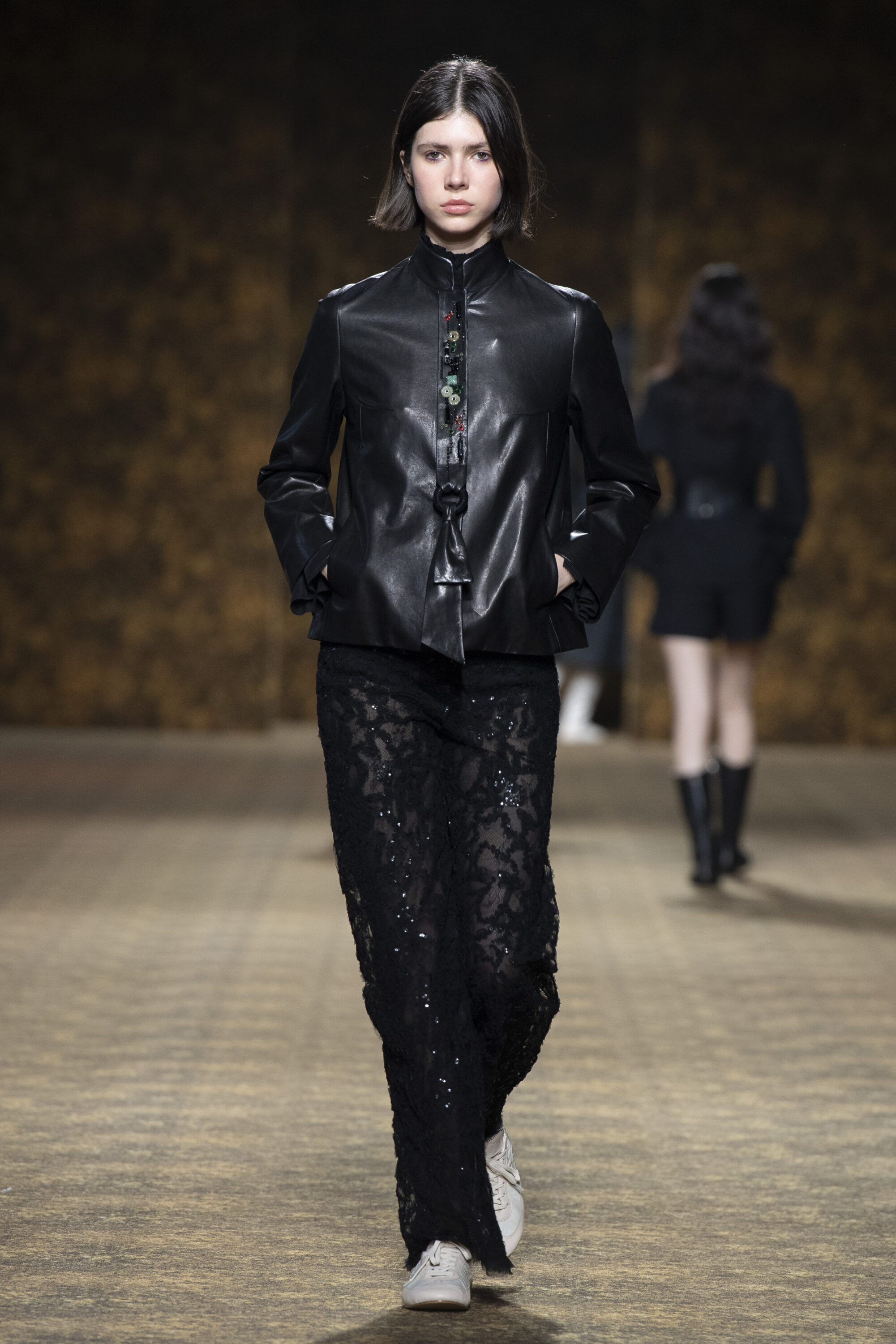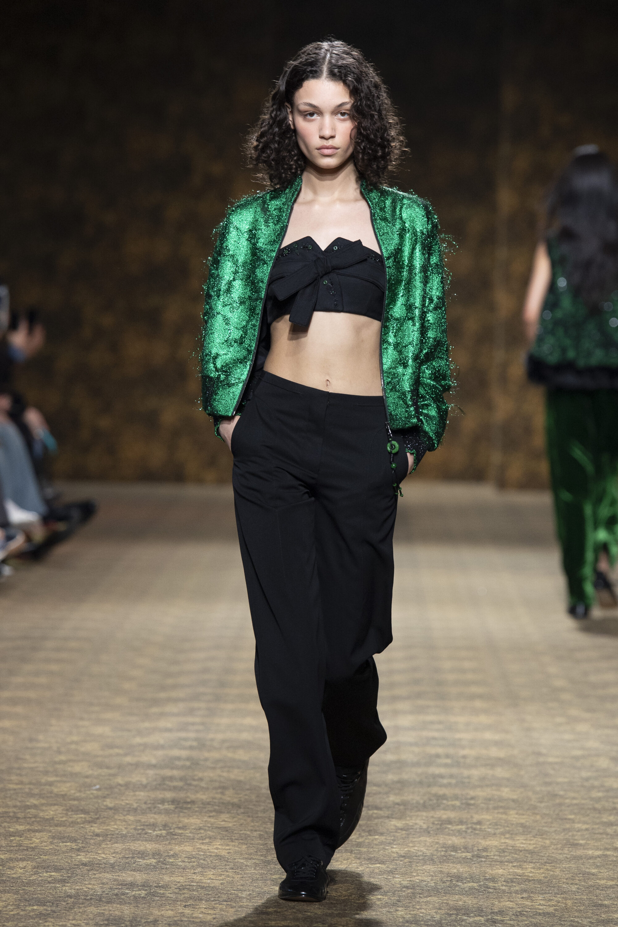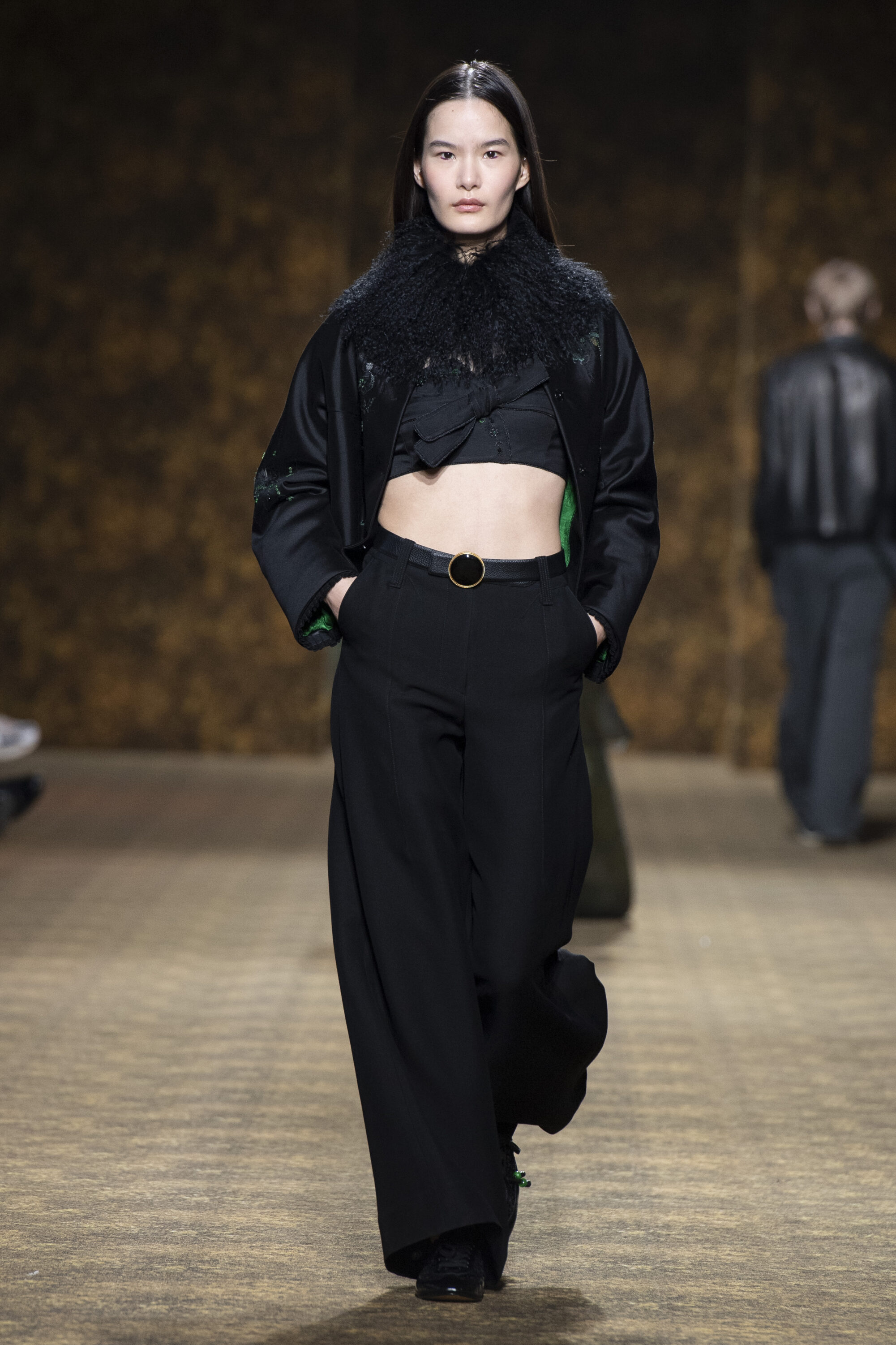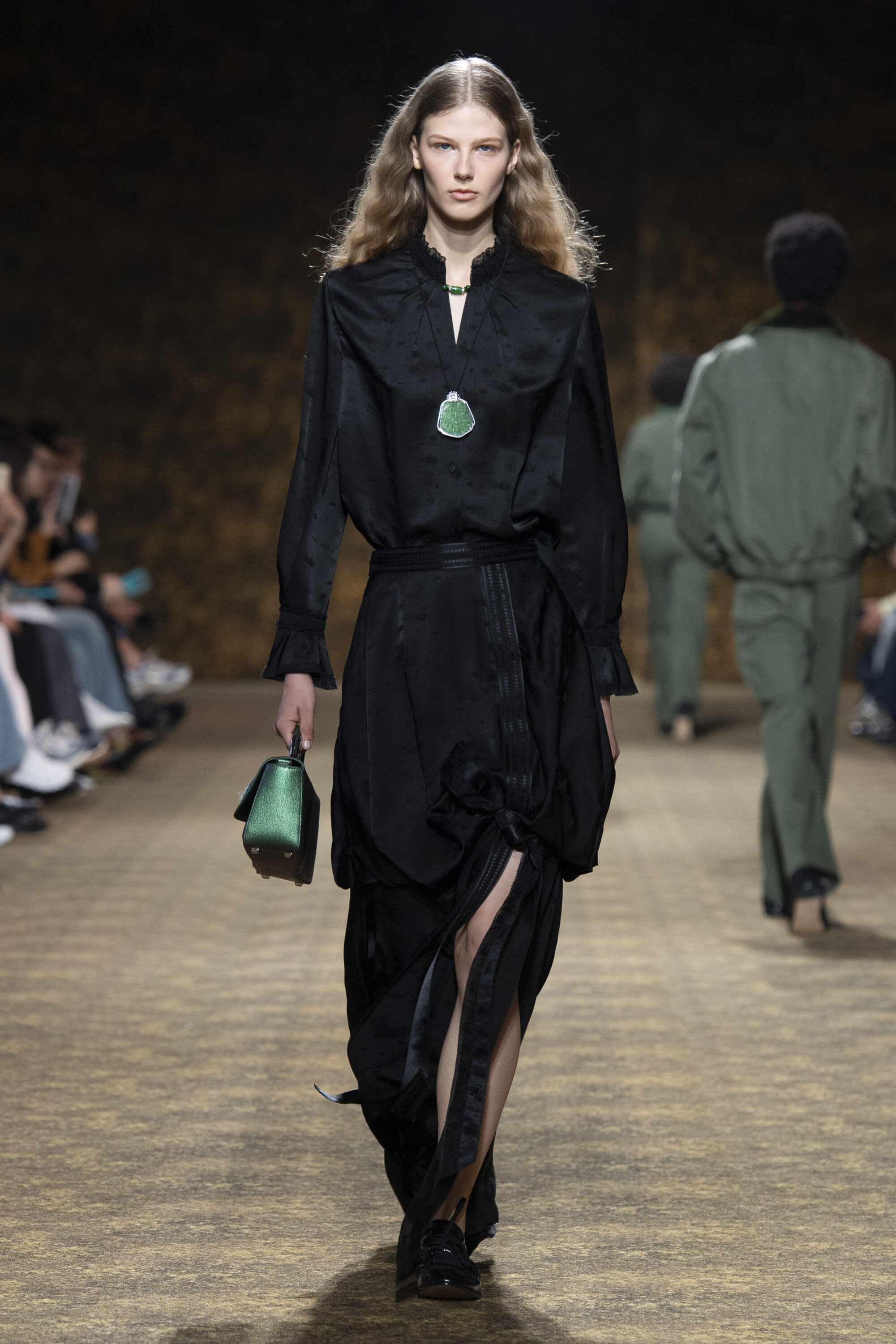 玉作為本季的精神符碼,小至玉片鑲嵌於刷色牛仔,隨步伐輕響,為日常材質注入玉石的溫潤光澤;大至平安扣繫於身,化為貼身的精神標記。配件也延伸玉的圓融精神,平安扣、玉珠、玉片與玉鐲圓形意象象徵圓滿、流轉與守護;項鍊可轉換為別針,使玉在不同佩戴方式間切換,如舞動中變換節奏。