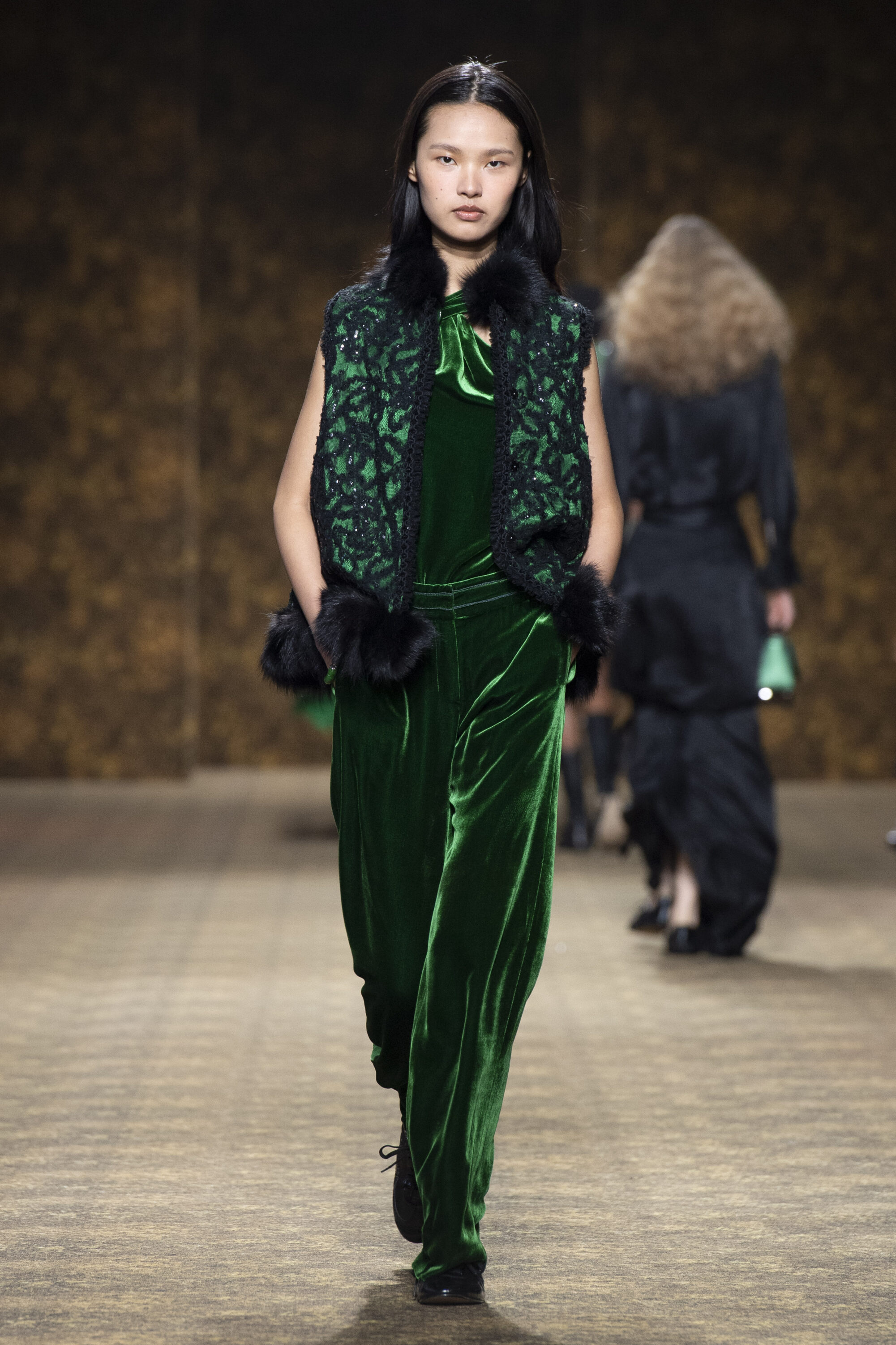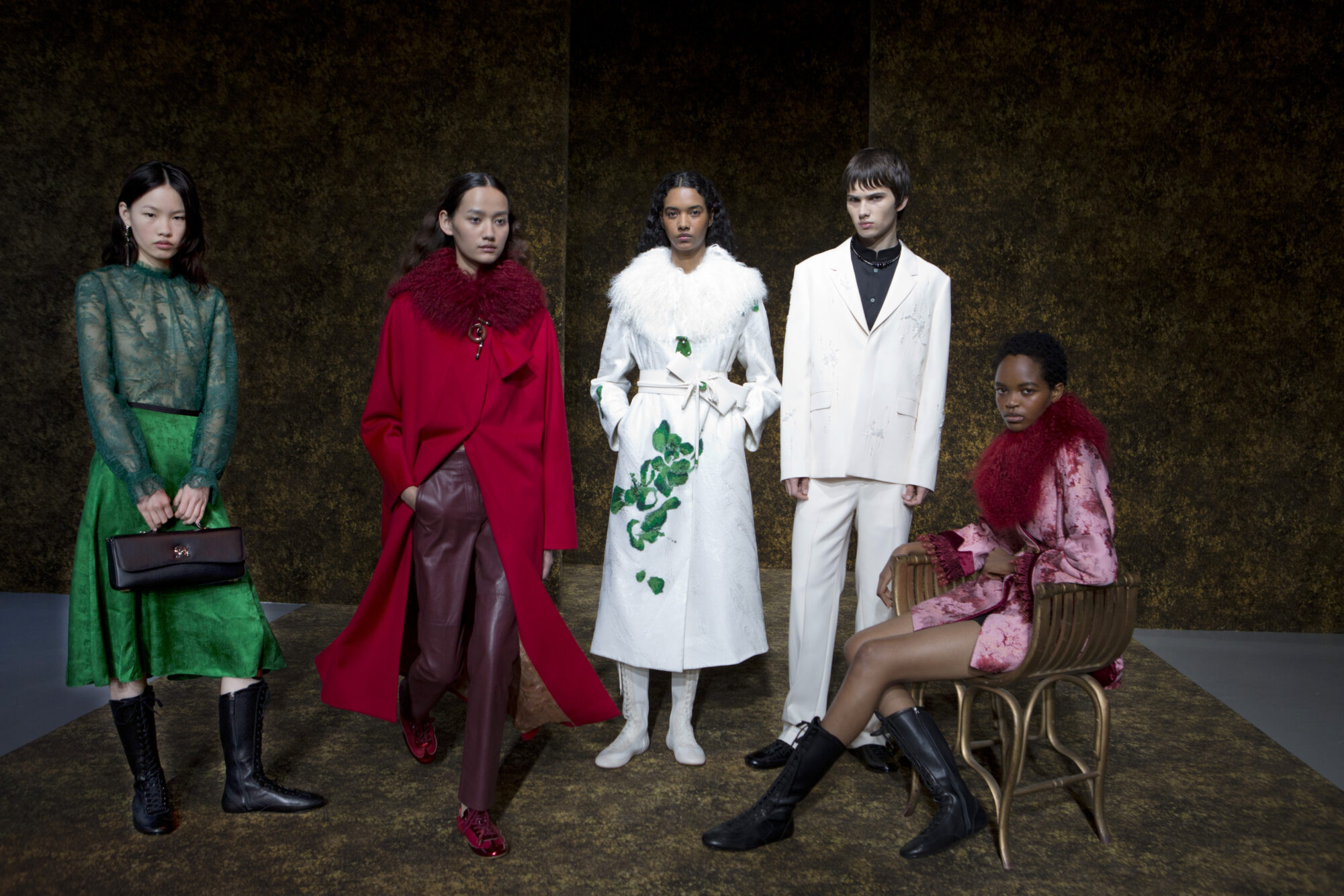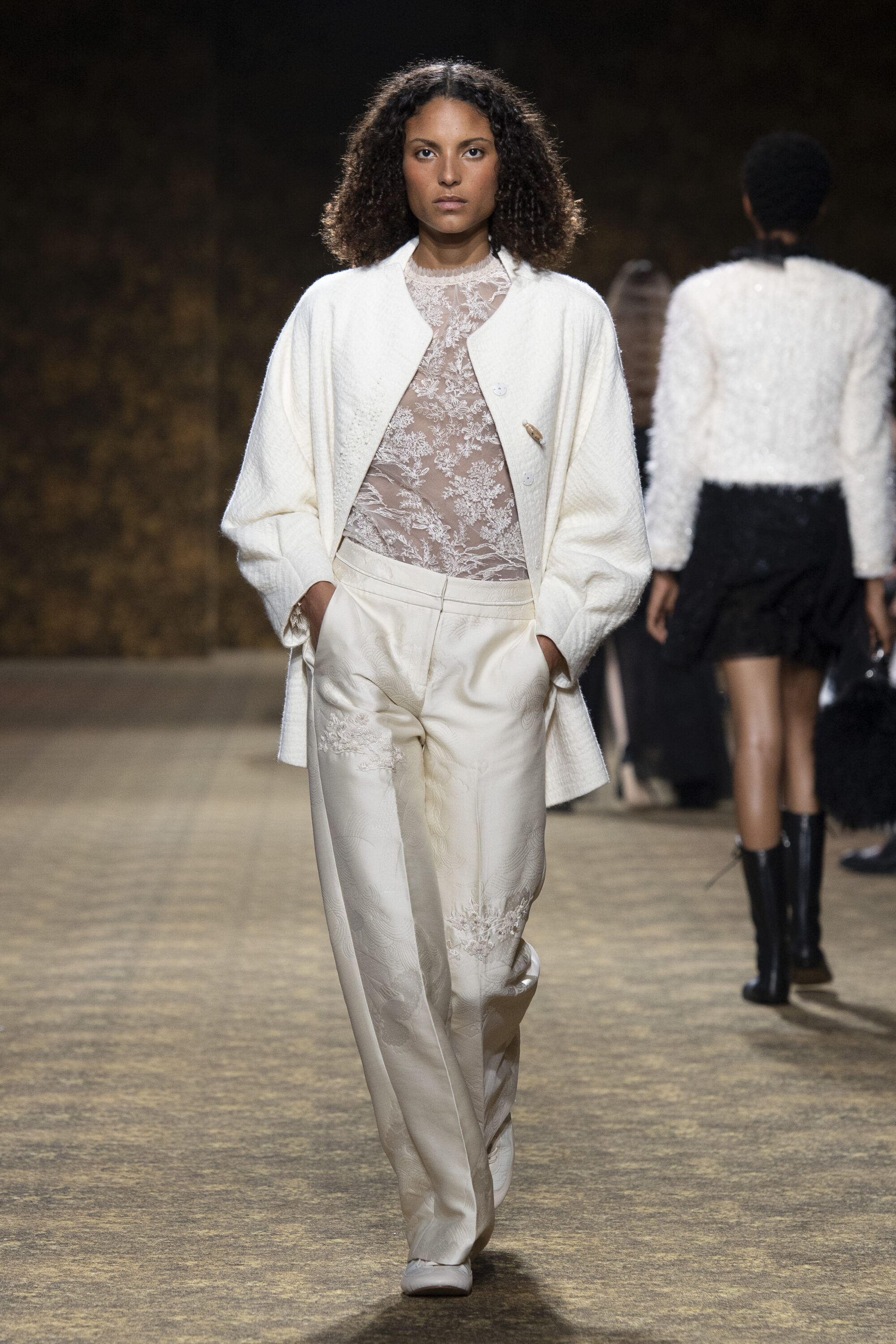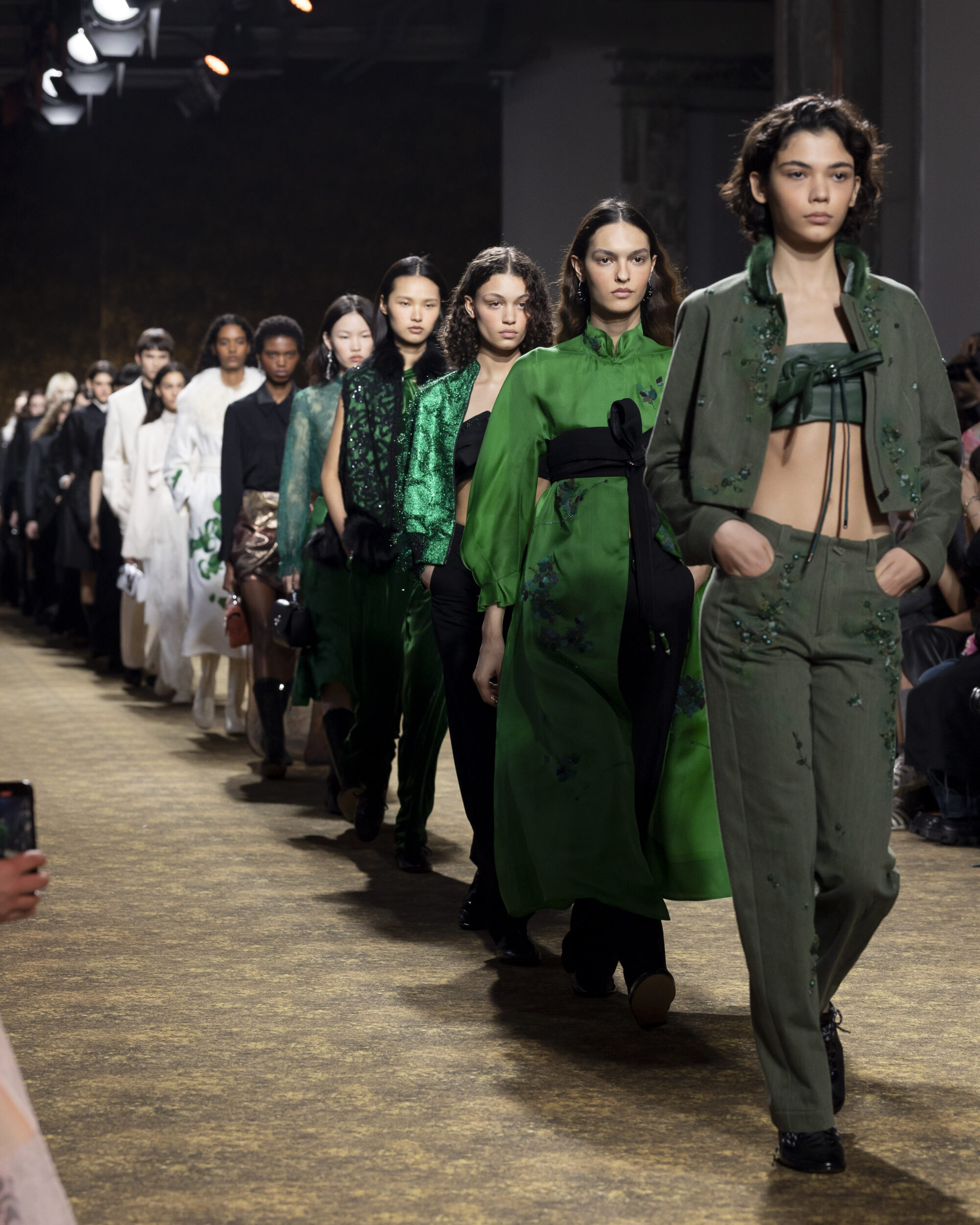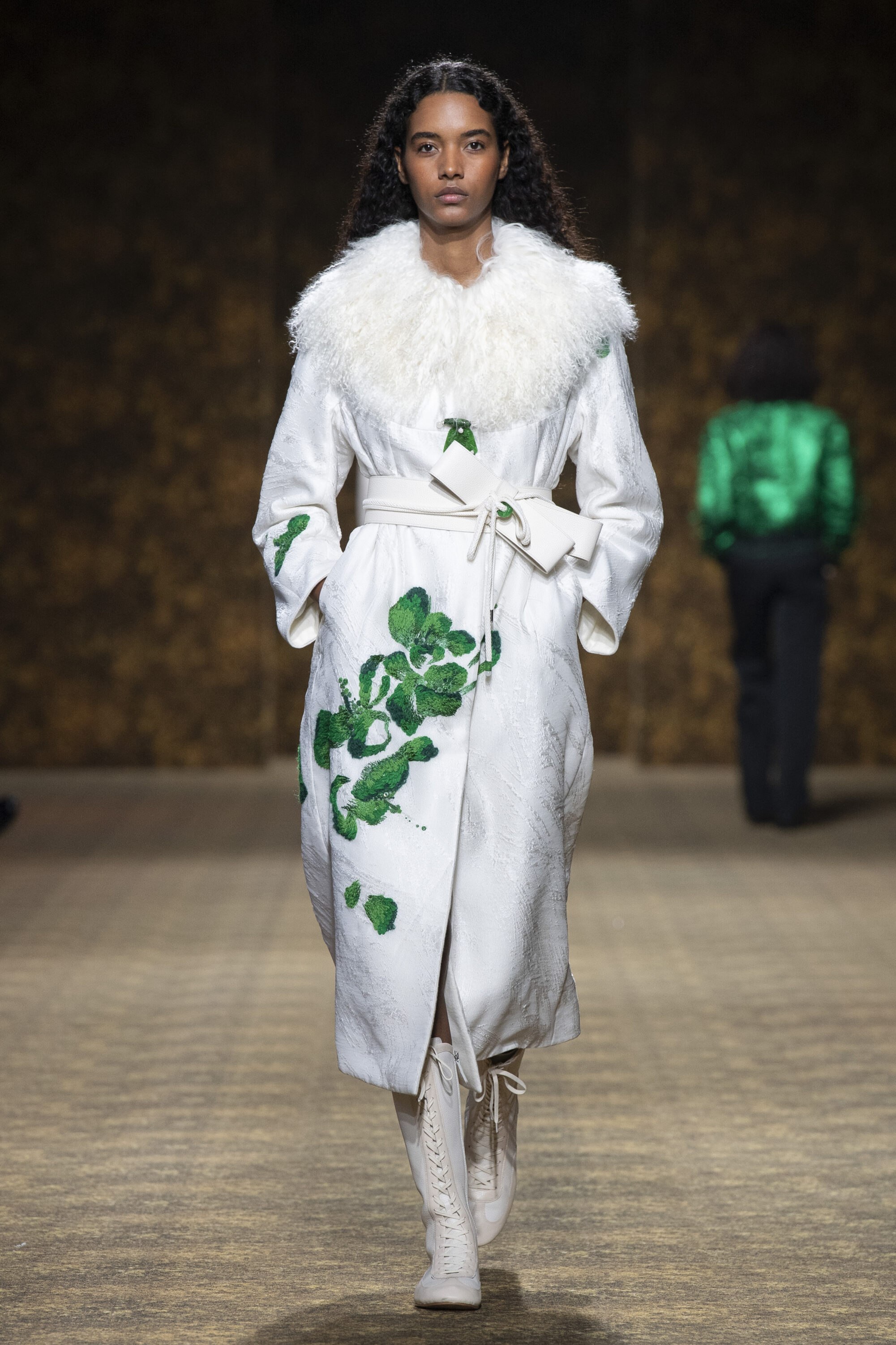 開版圖騰以山水、鹿紋與宮廷出遊為織錦意象,使服裝如同一幅隨行展開的畫卷;扶桑花、牡丹與團花構築繁盛流動樣貌;材質大幅出現金屬與翻毛,在冷暖間構築立體對比。