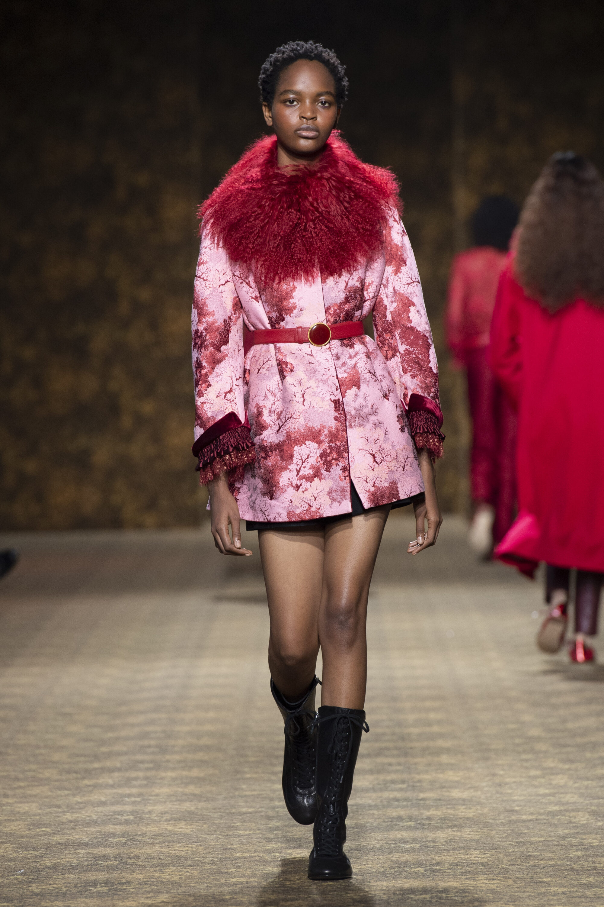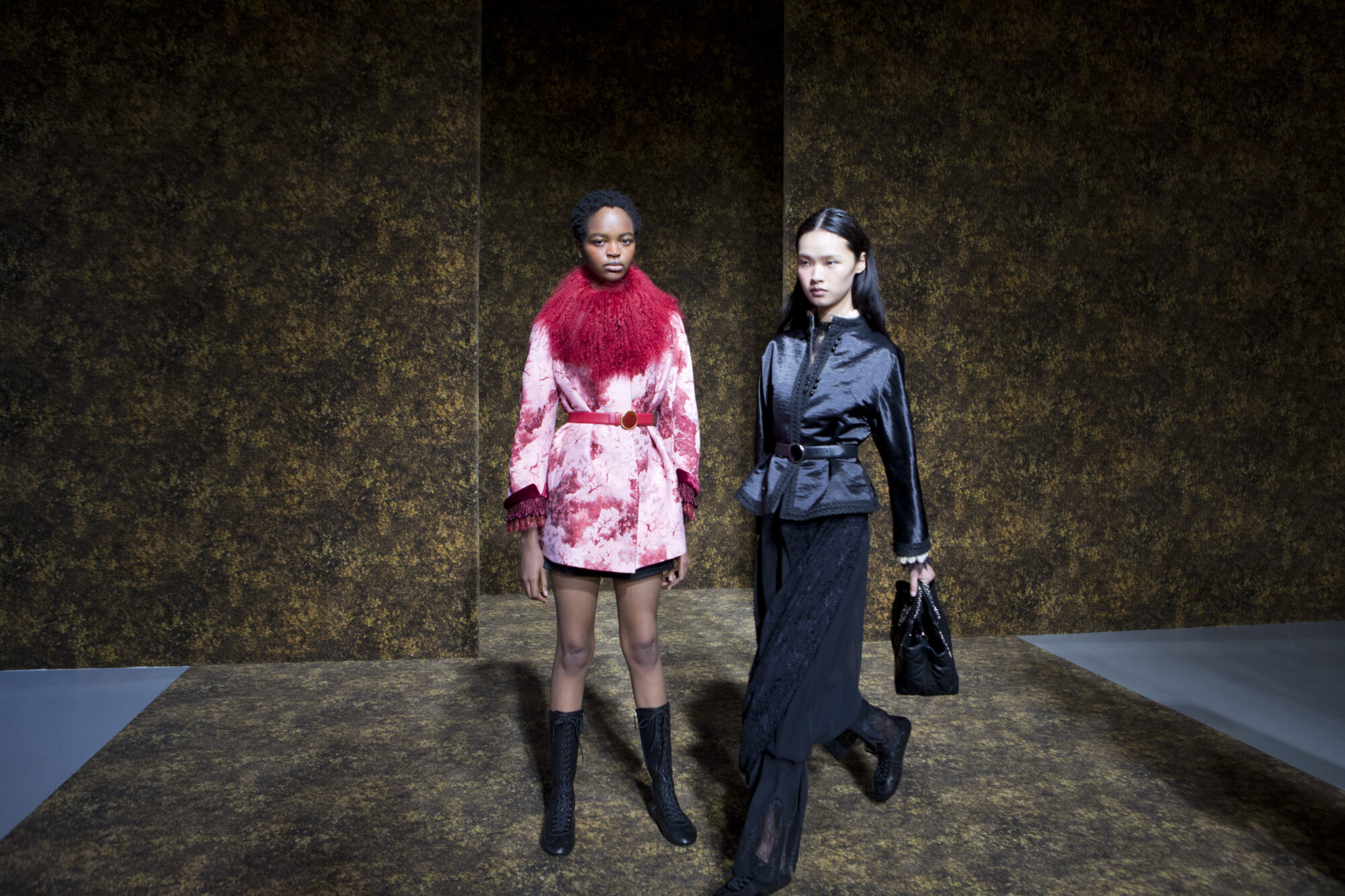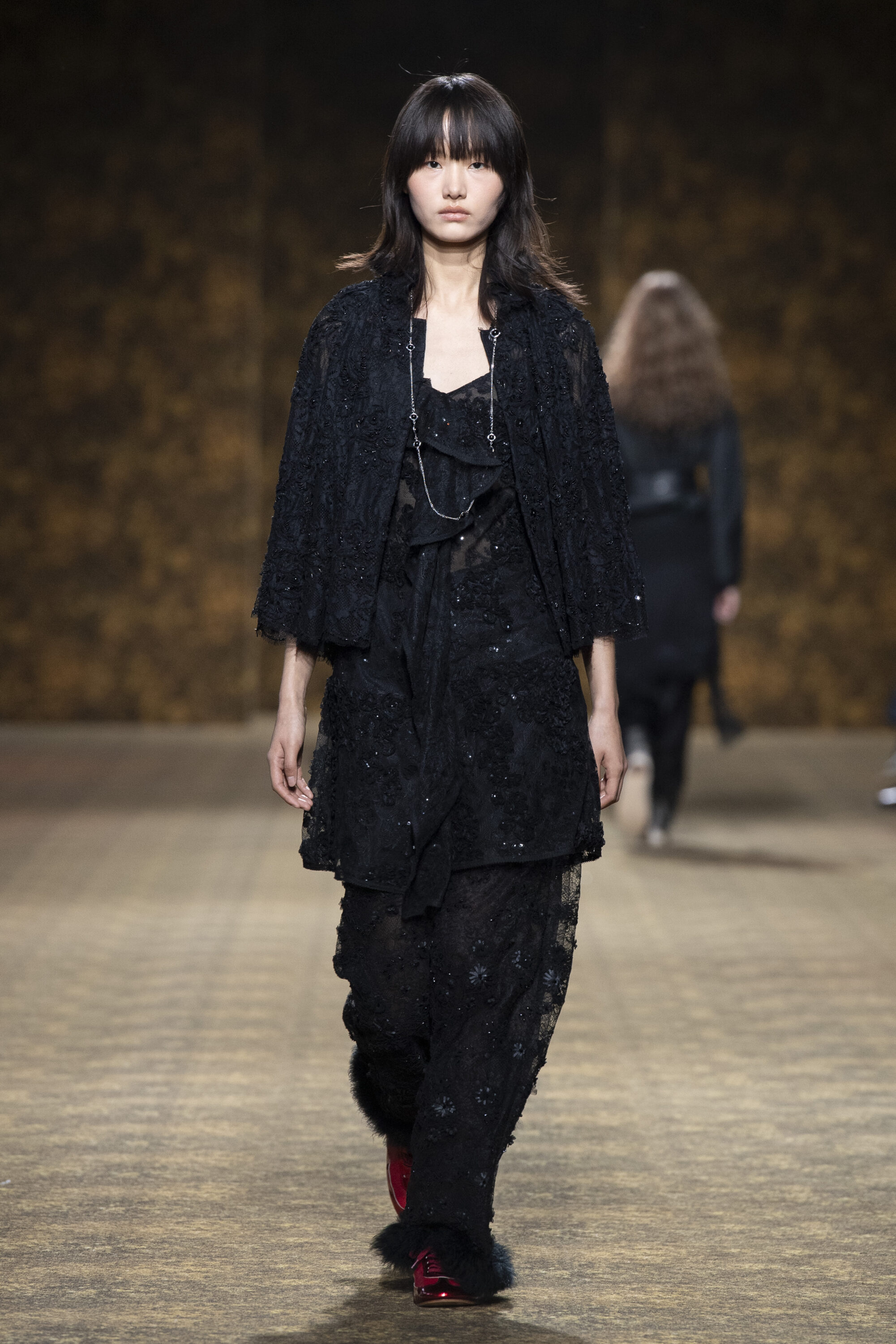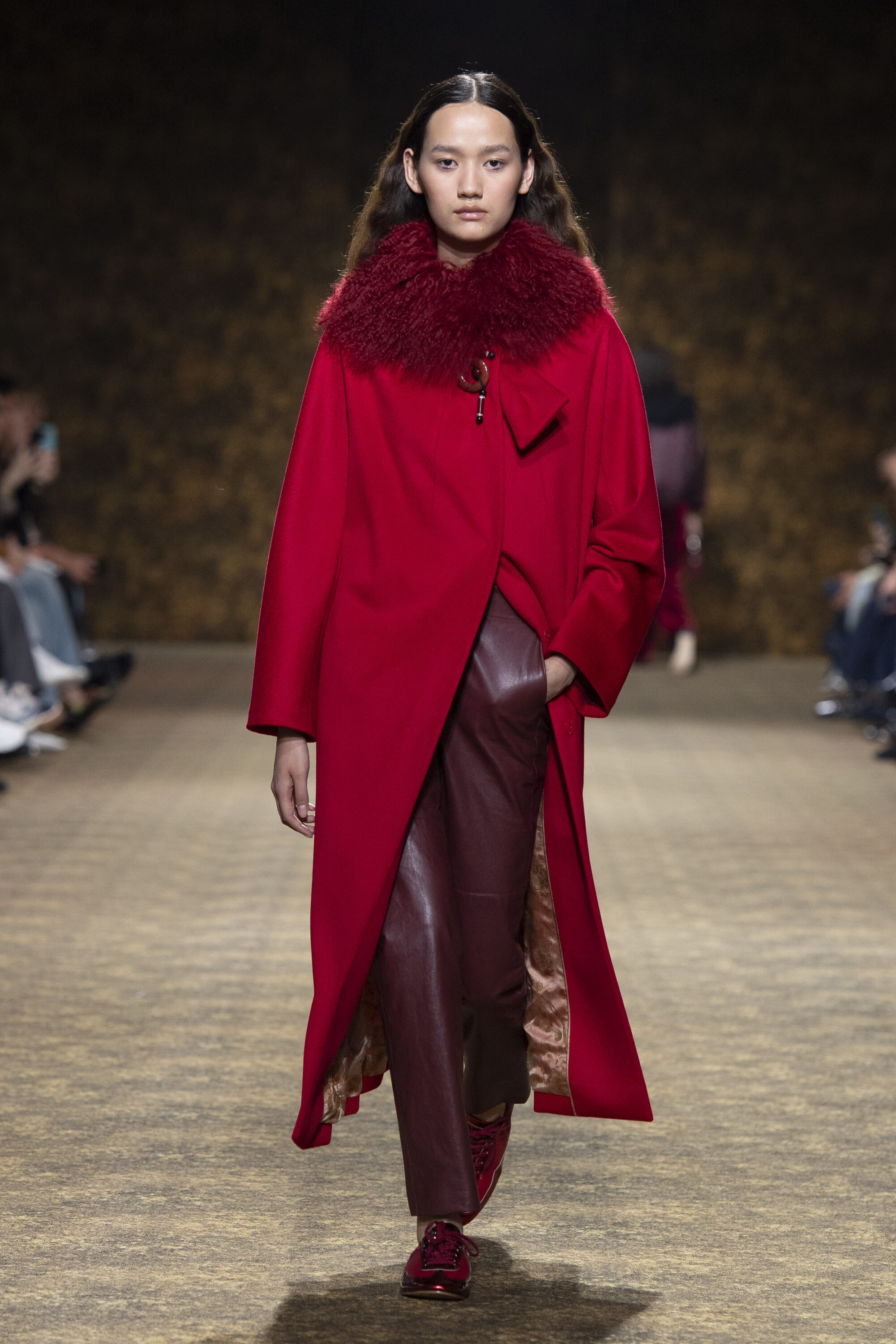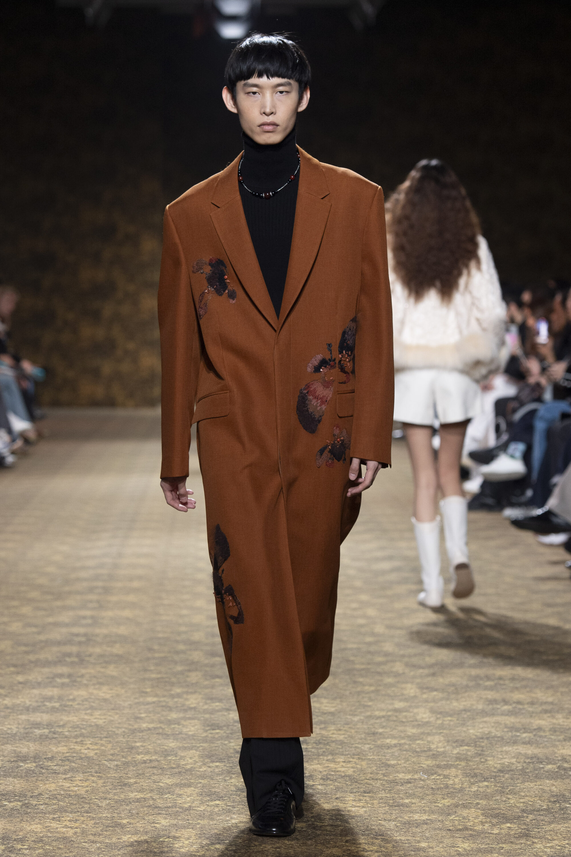 開版圖騰以山水、鹿紋與宮廷出遊為織錦意象,使服裝如同一幅隨行展開的畫卷;扶桑花、牡丹與團花構築繁盛流動樣貌;材質大幅出現金屬與翻毛,在冷暖間構築立體對比。