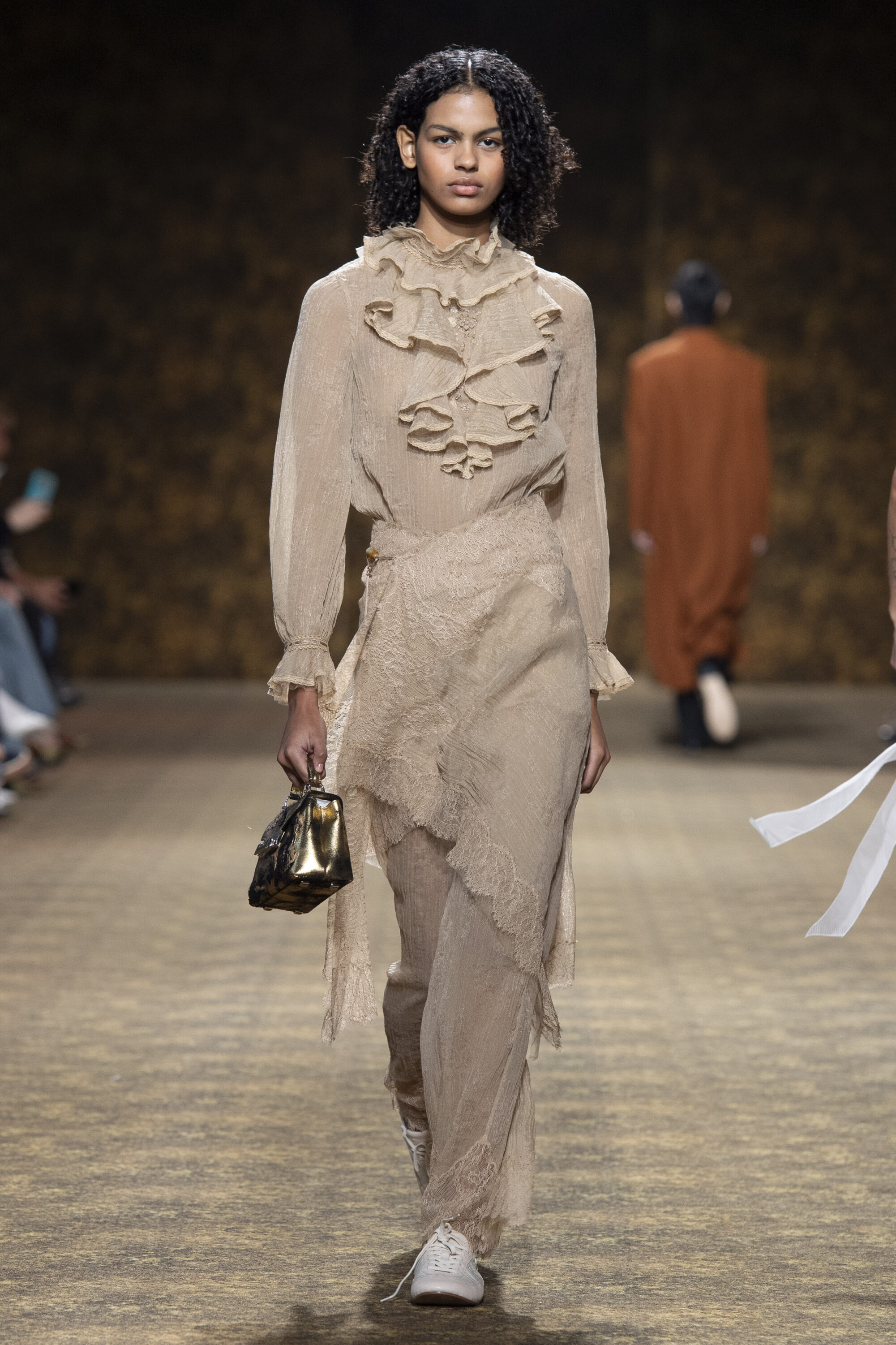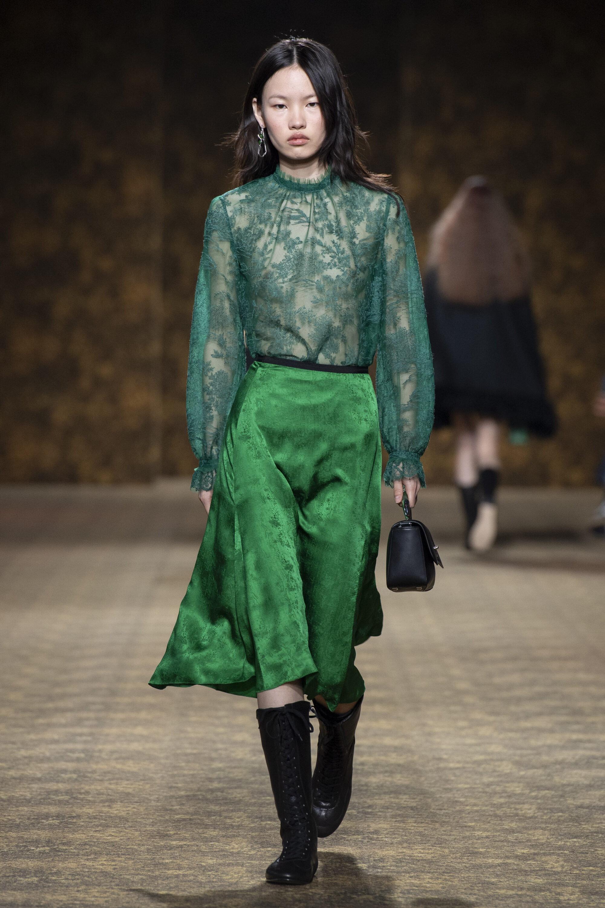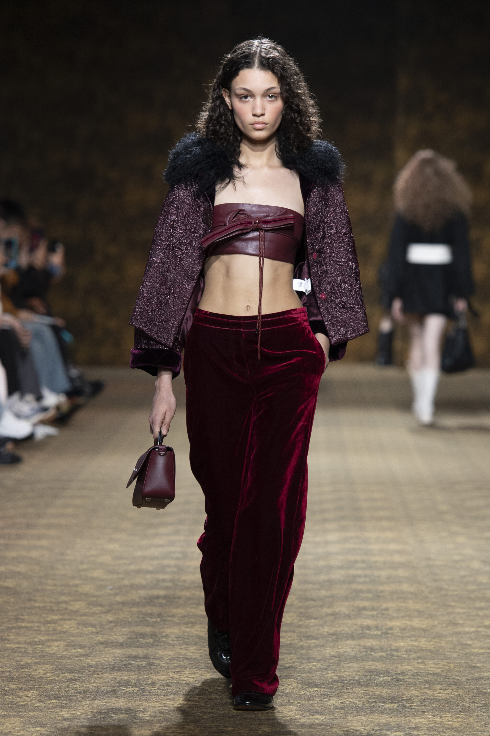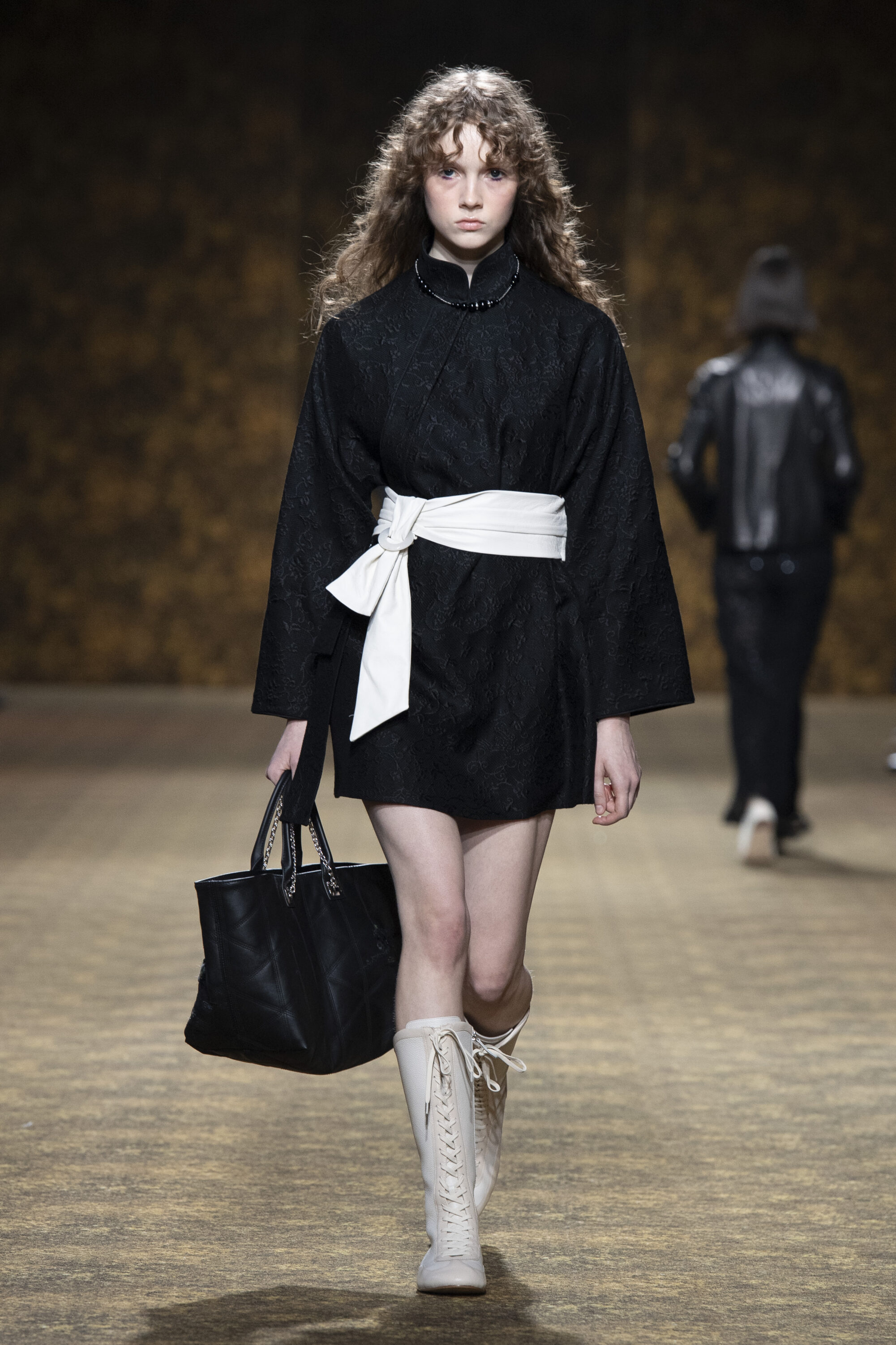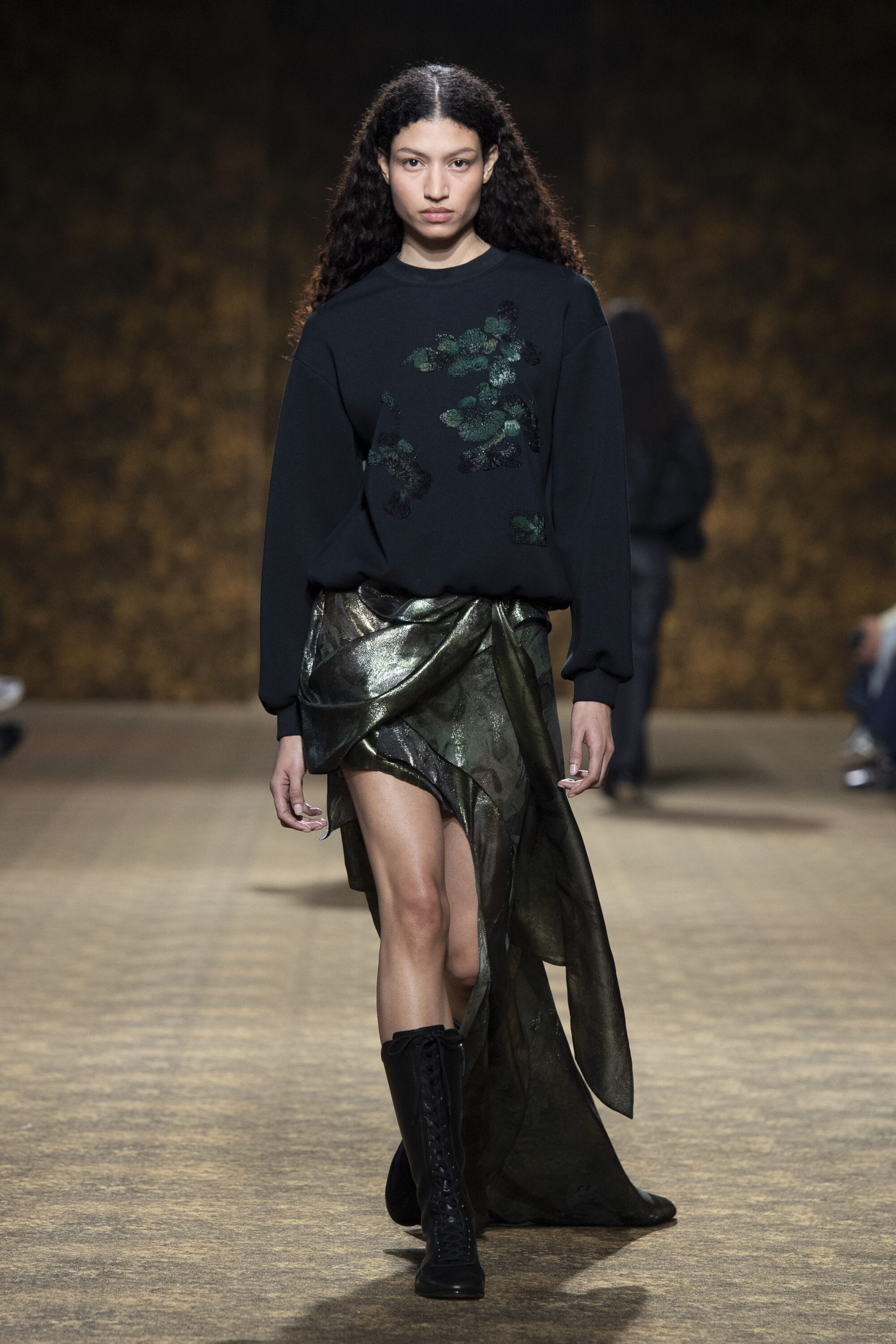 開版圖騰以山水、鹿紋與宮廷出遊為織錦意象,使服裝如同一幅隨行展開的畫卷;扶桑花、牡丹與團花構築繁盛流動樣貌;材質大幅出現金屬與翻毛,在冷暖間構築立體對比。
