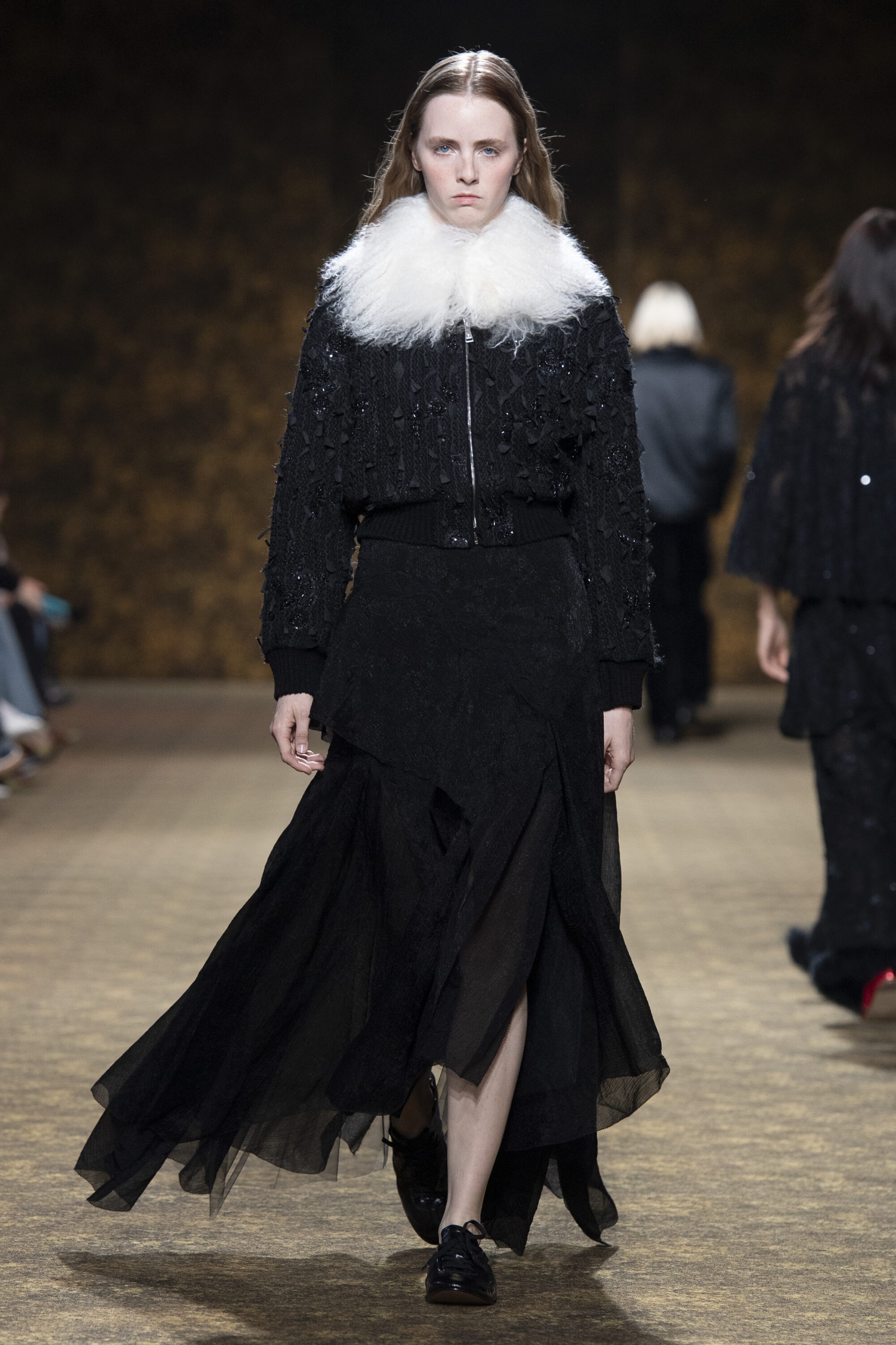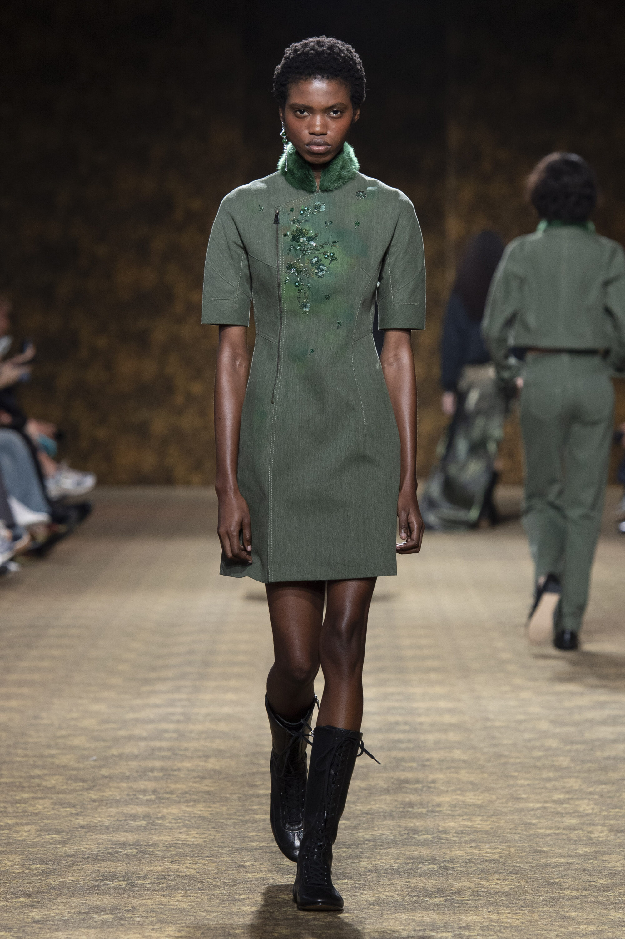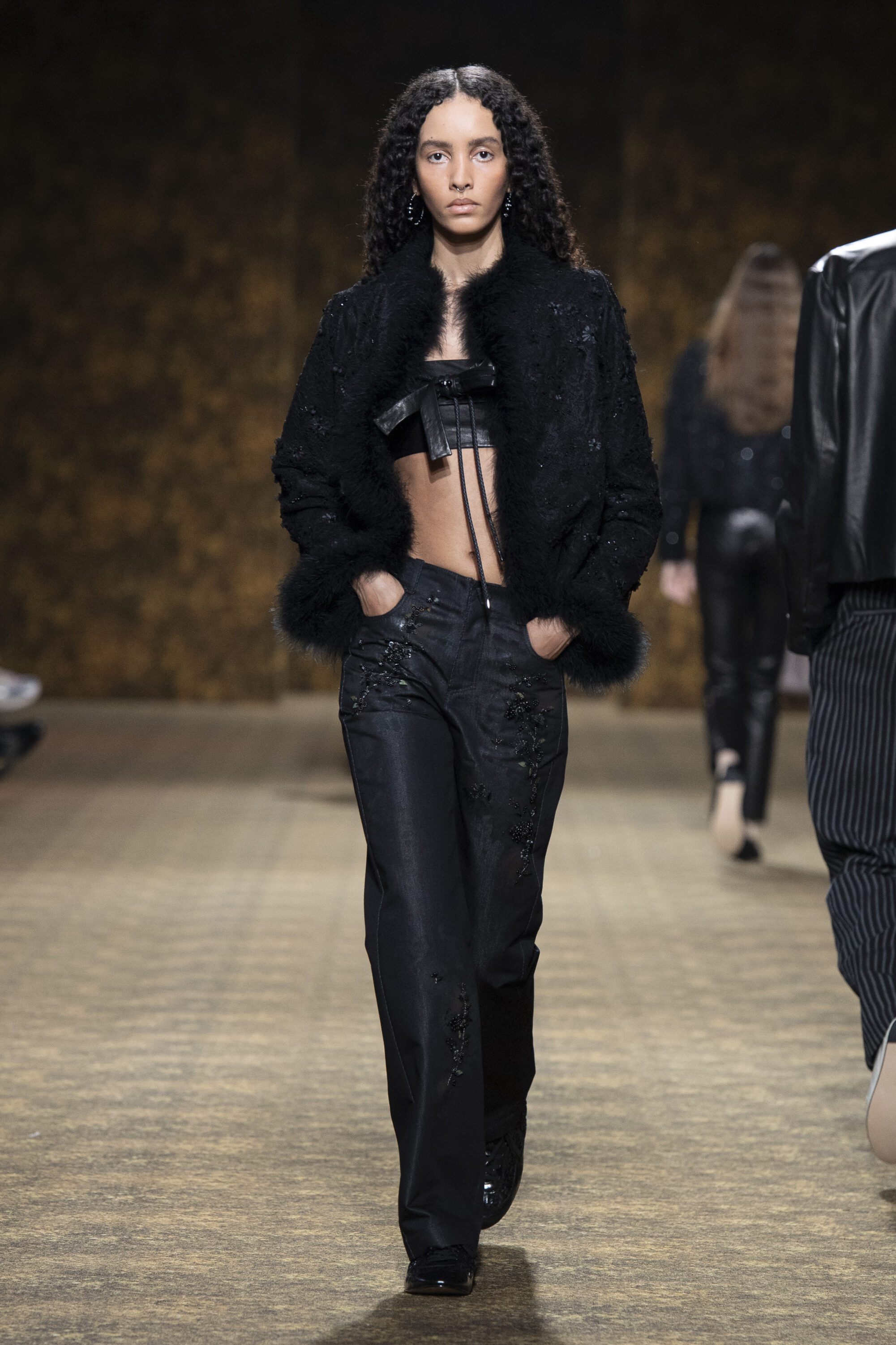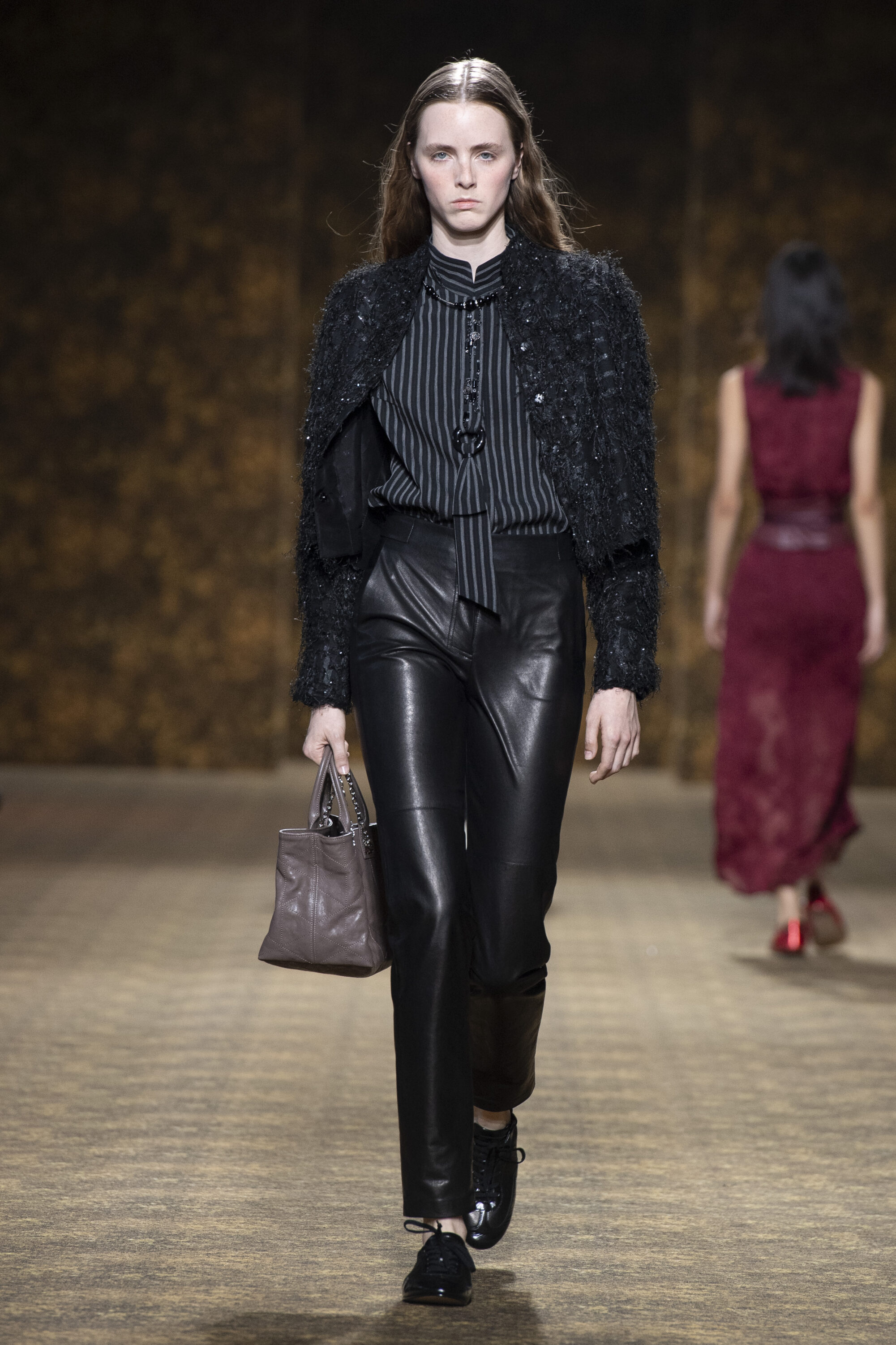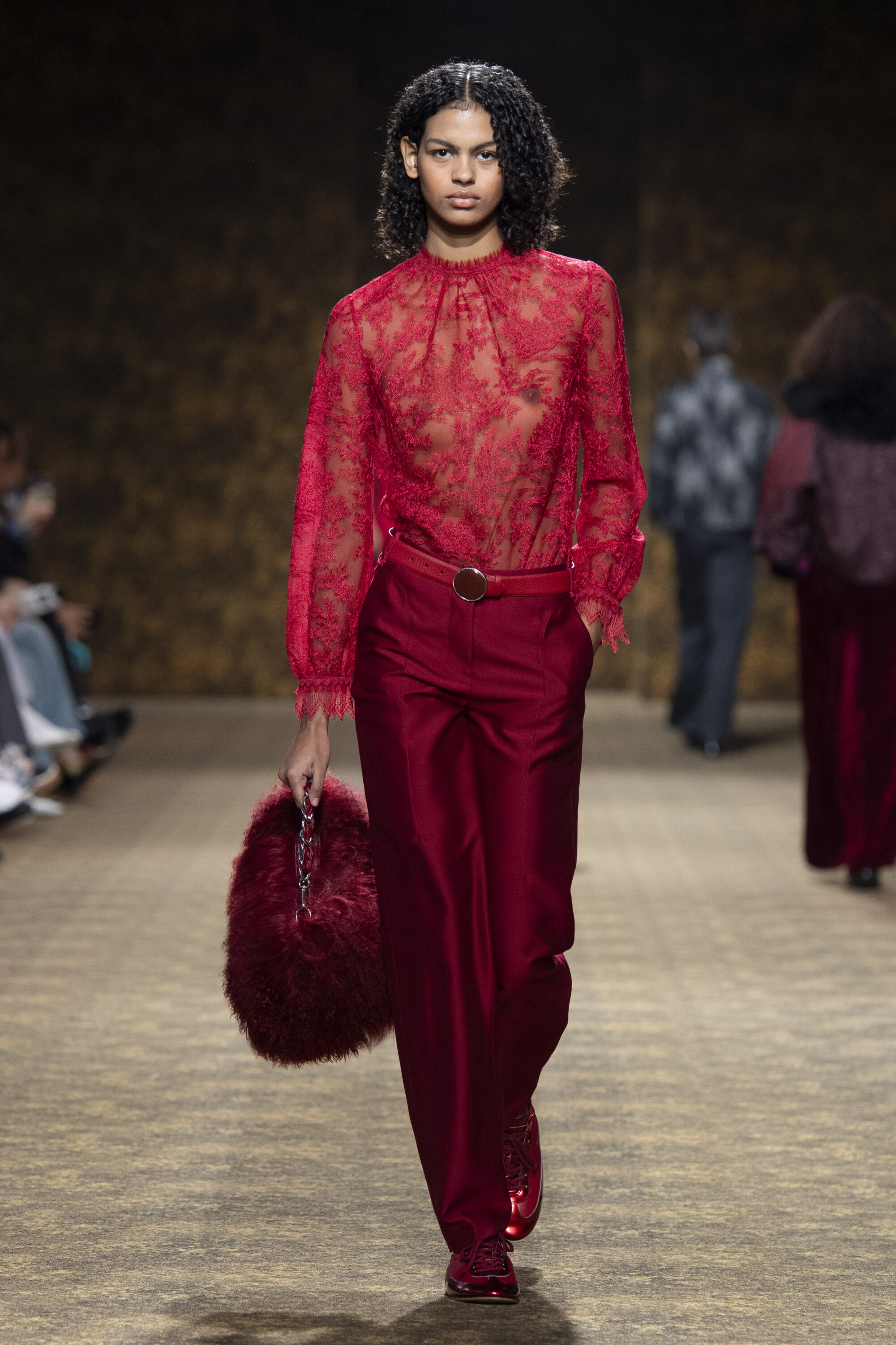 開版圖騰以山水、鹿紋與宮廷出遊為織錦意象,使服裝如同一幅隨行展開的畫卷;扶桑花、牡丹與團花構築繁盛流動樣貌;材質大幅出現金屬與翻毛,在冷暖間構築立體對比。