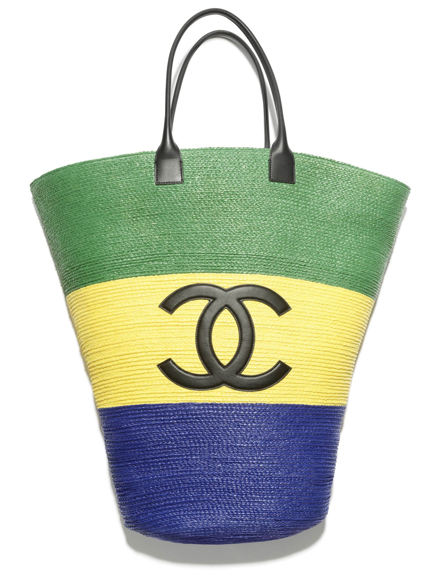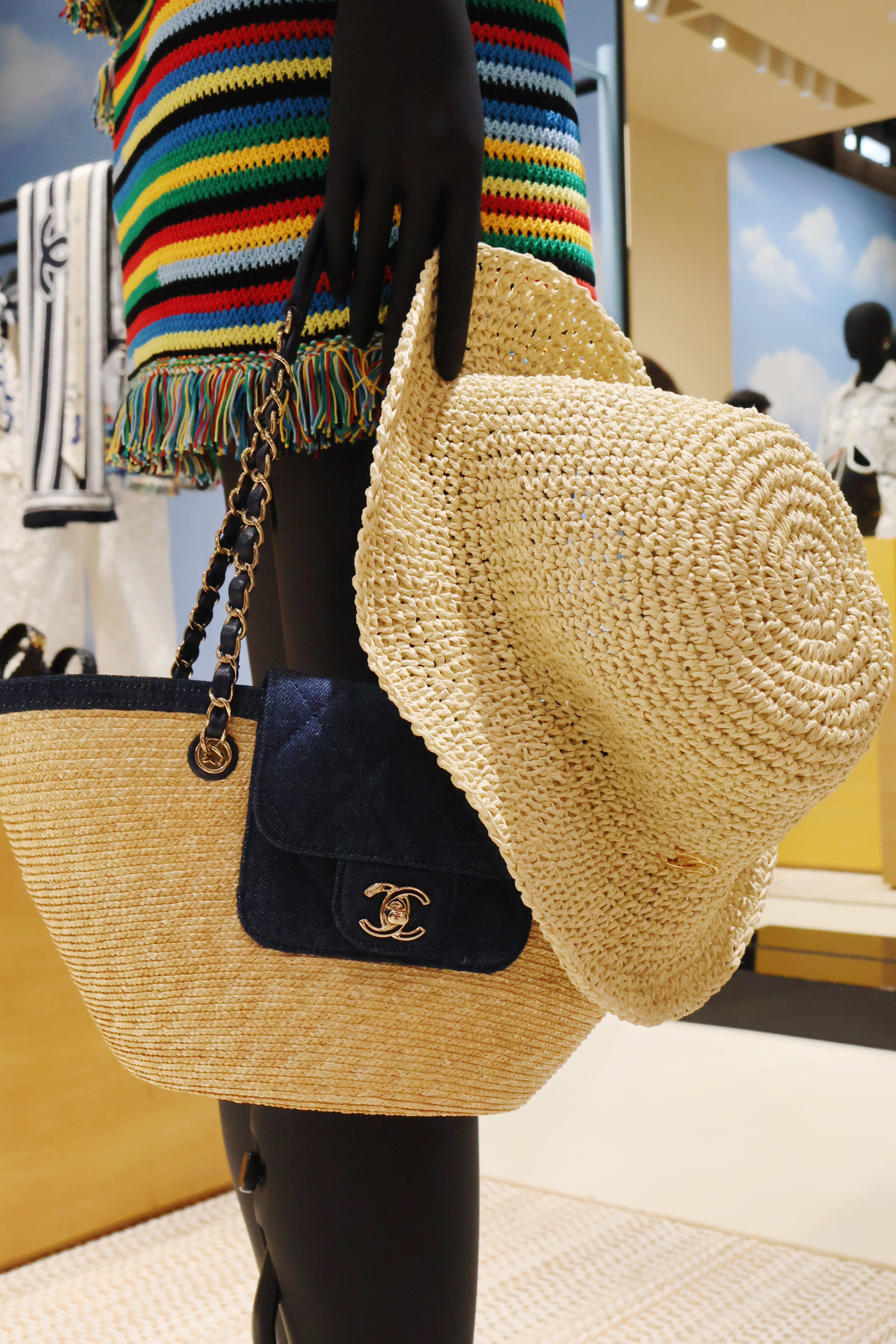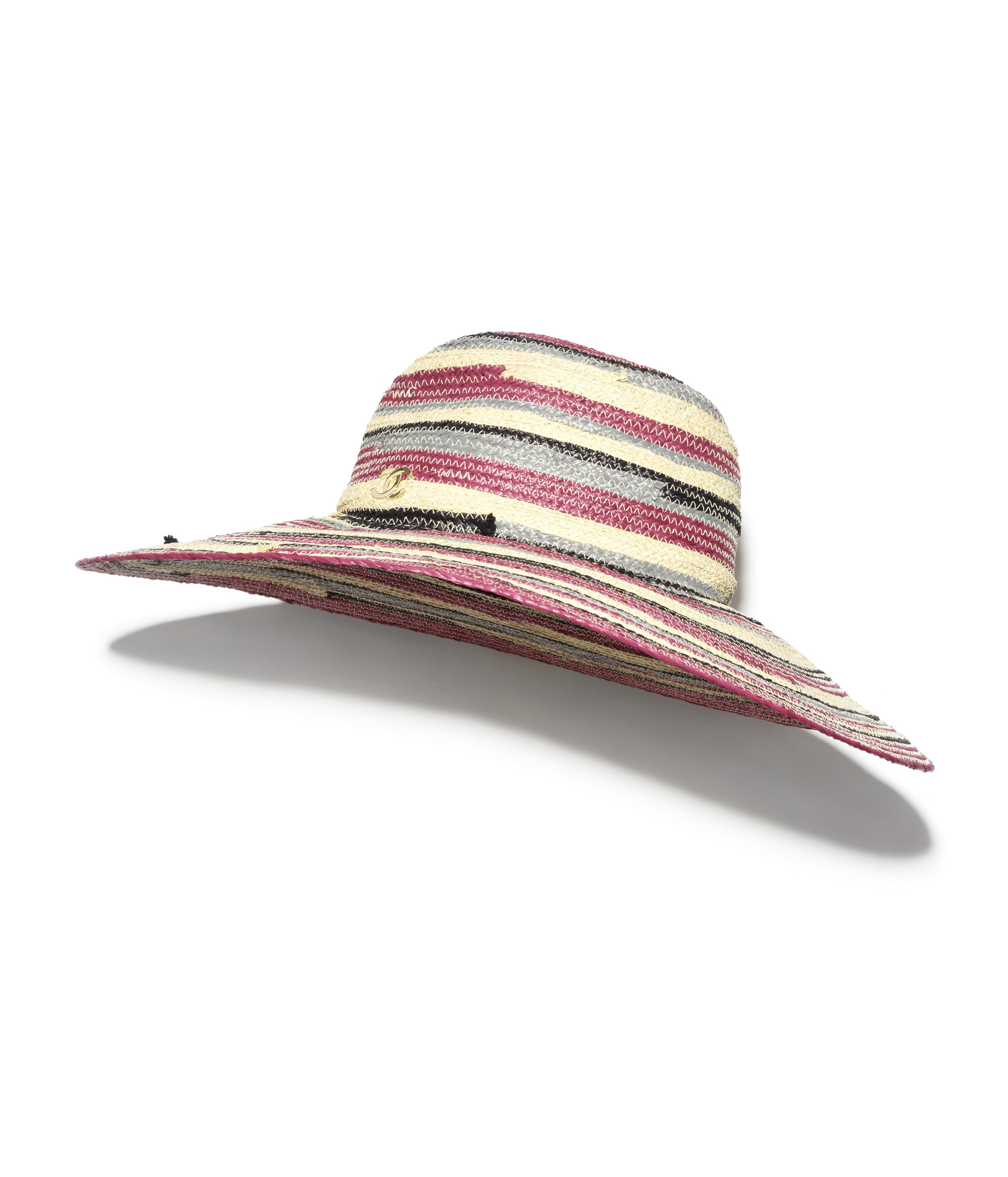 多彩條紋雙C LOGO編織草帽;多彩條紋拉菲草口蓋包