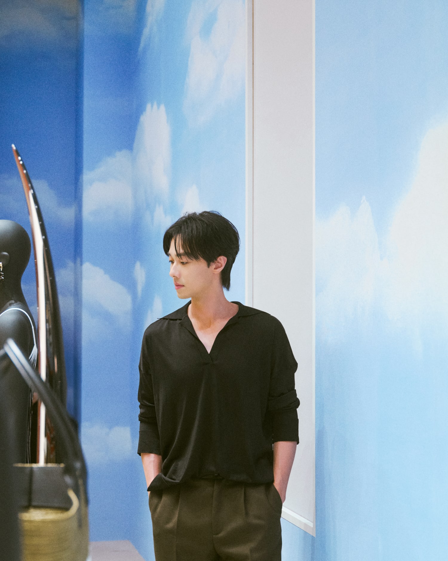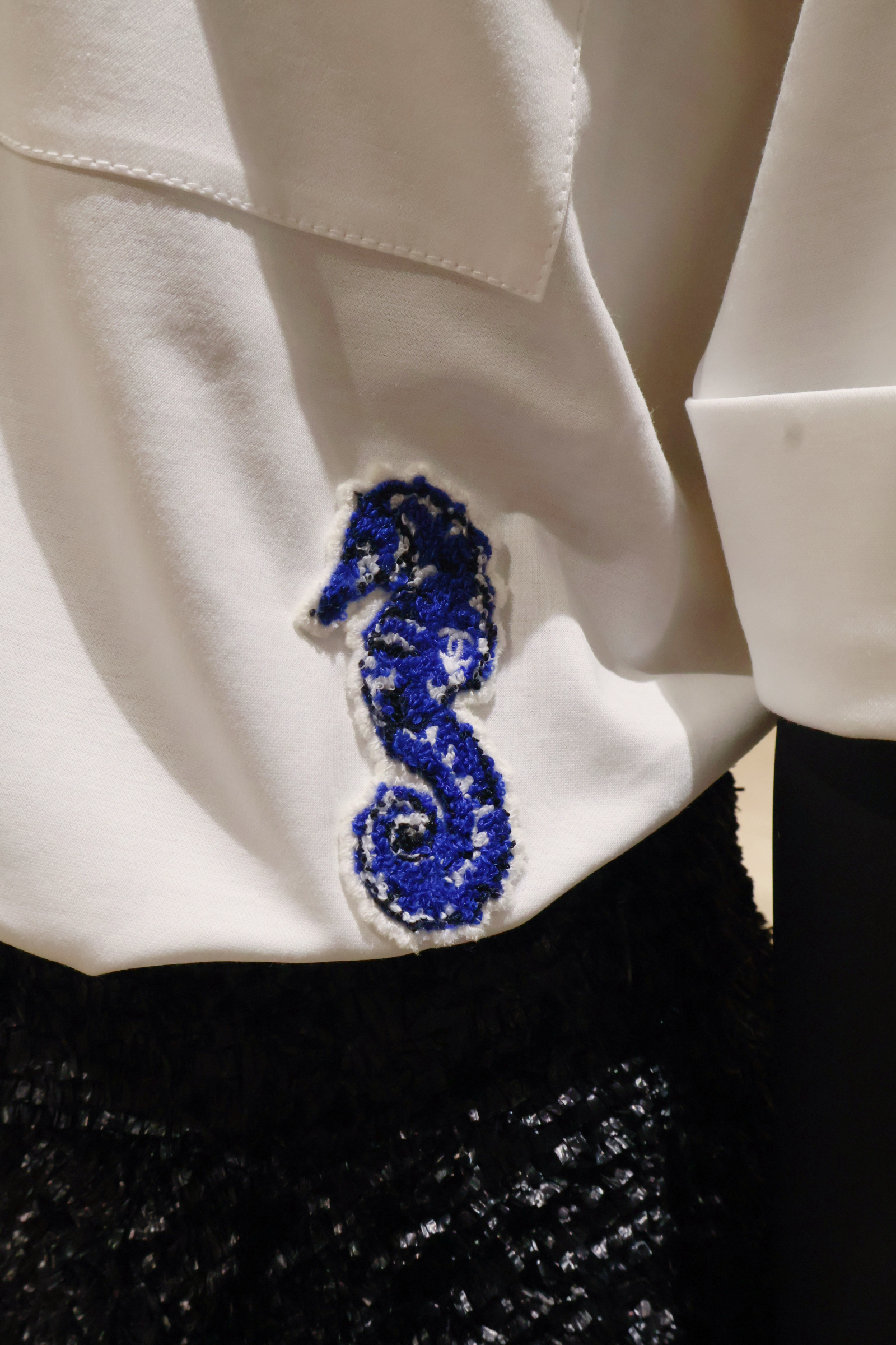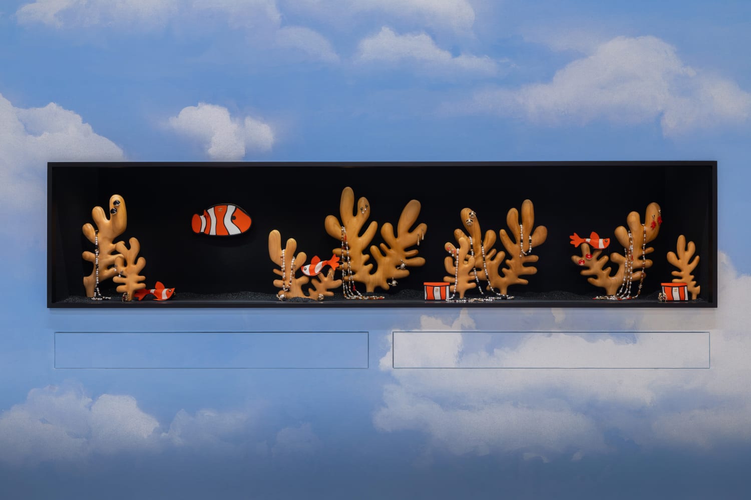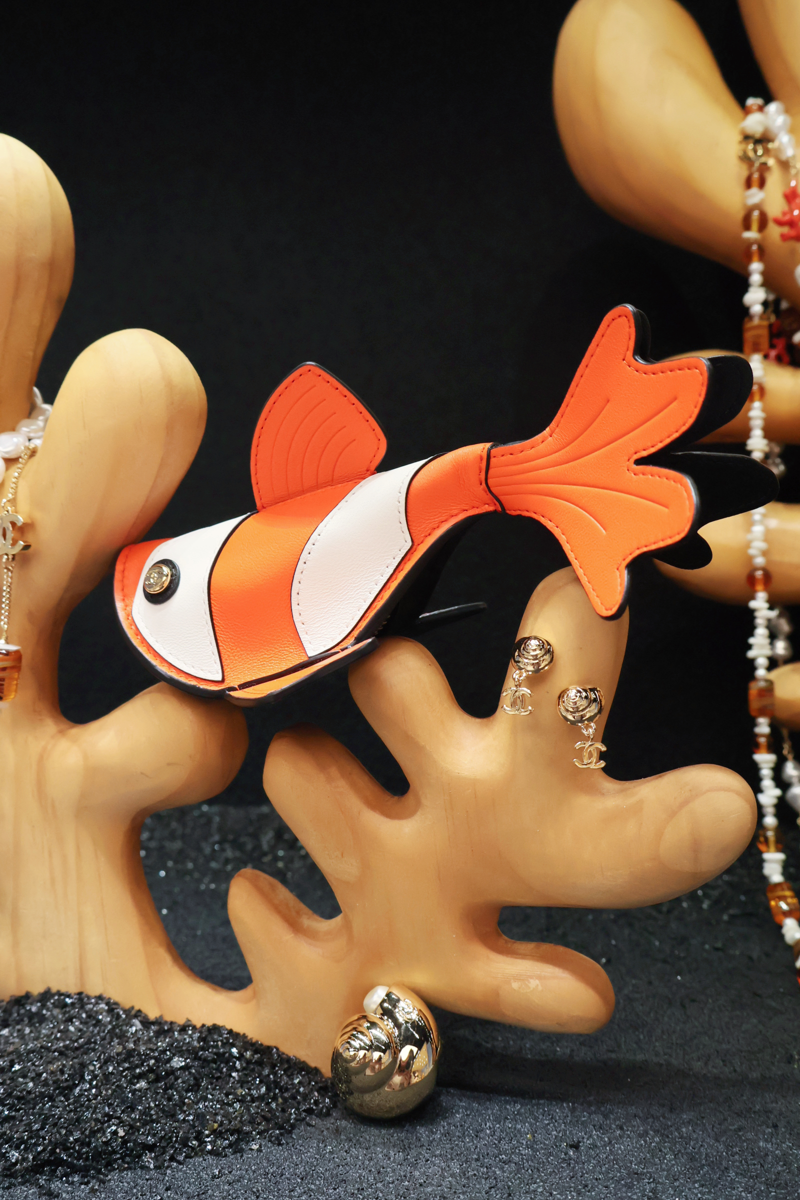 櫥窗則被打造成一座水族箱,在黑色細沙的襯托下,飾品及小皮件漂浮其中,也呼應今年廣告的視覺語言。