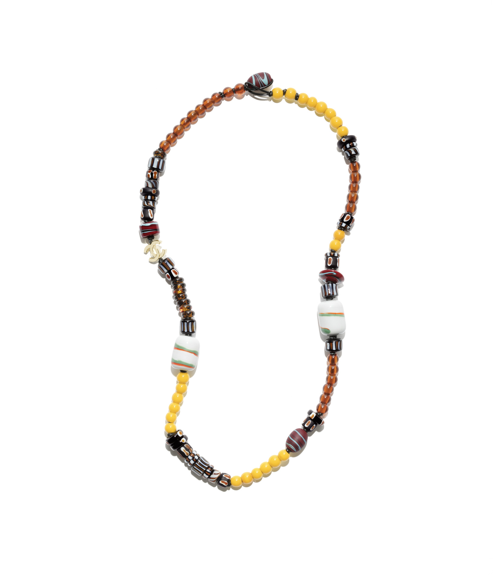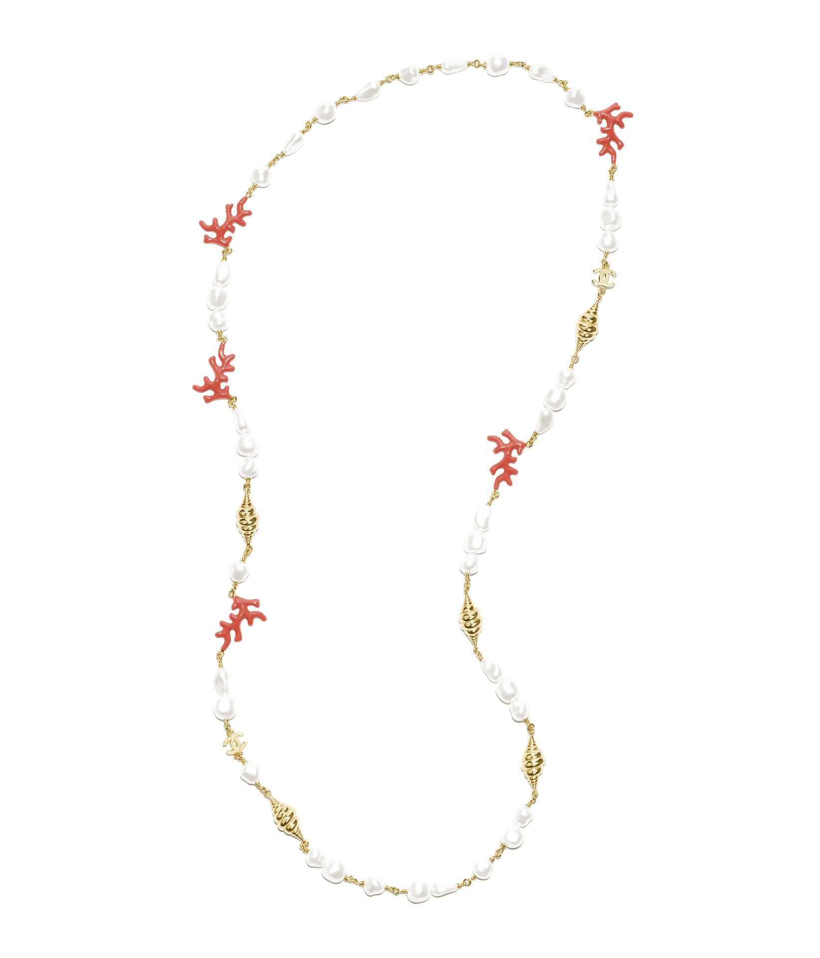 多彩珊瑚造型與幻象珍珠長項鍊;多彩珠飾飾以雙C LOGO長項鍊