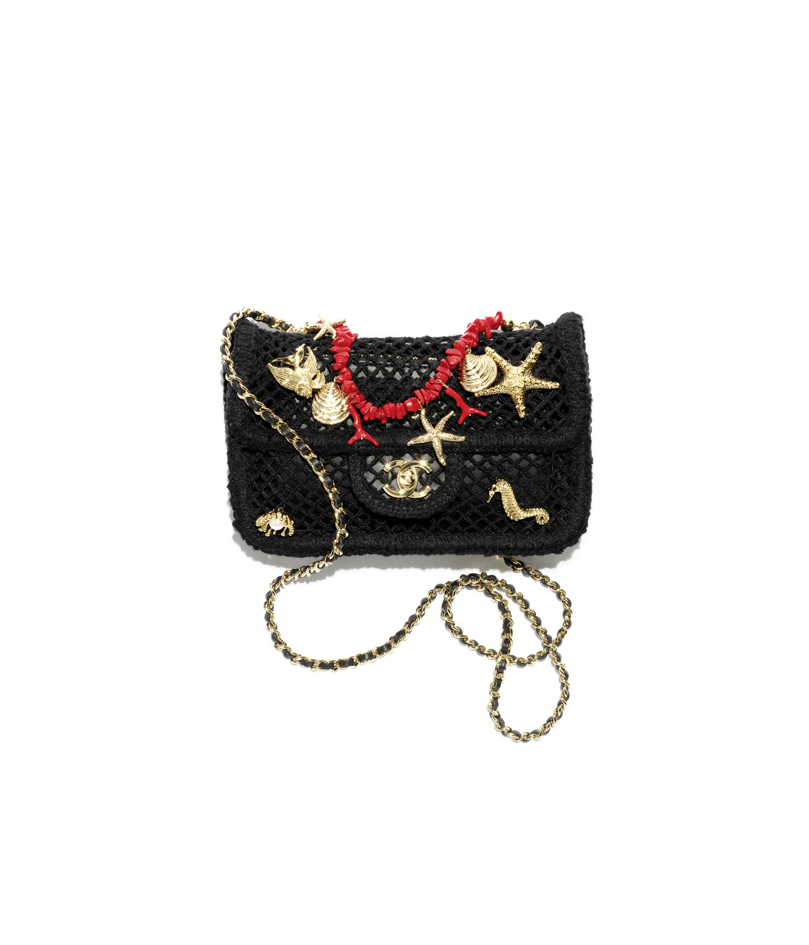 米色拉菲草編織口蓋包;黑色飾以珊瑚與金色墜飾網狀口蓋包