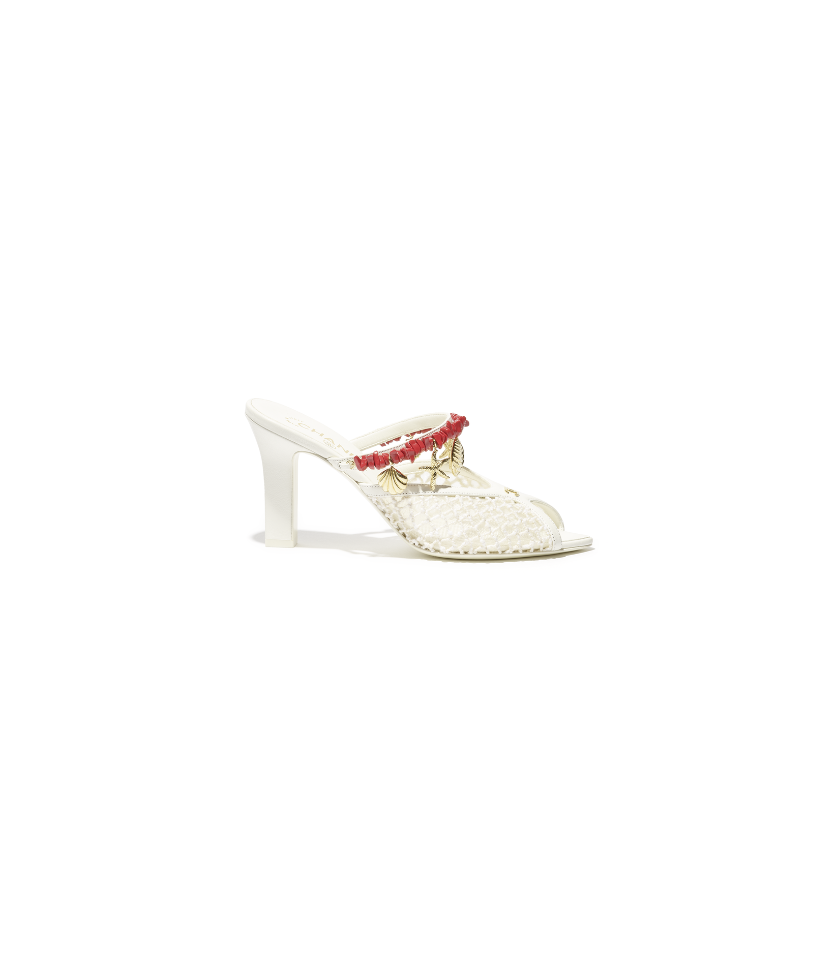 白色網狀飾以珊瑚與金色墜飾高跟蜜兒拖鞋;黑色網狀飾以珊瑚與金色墜飾高跟蜜兒拖鞋