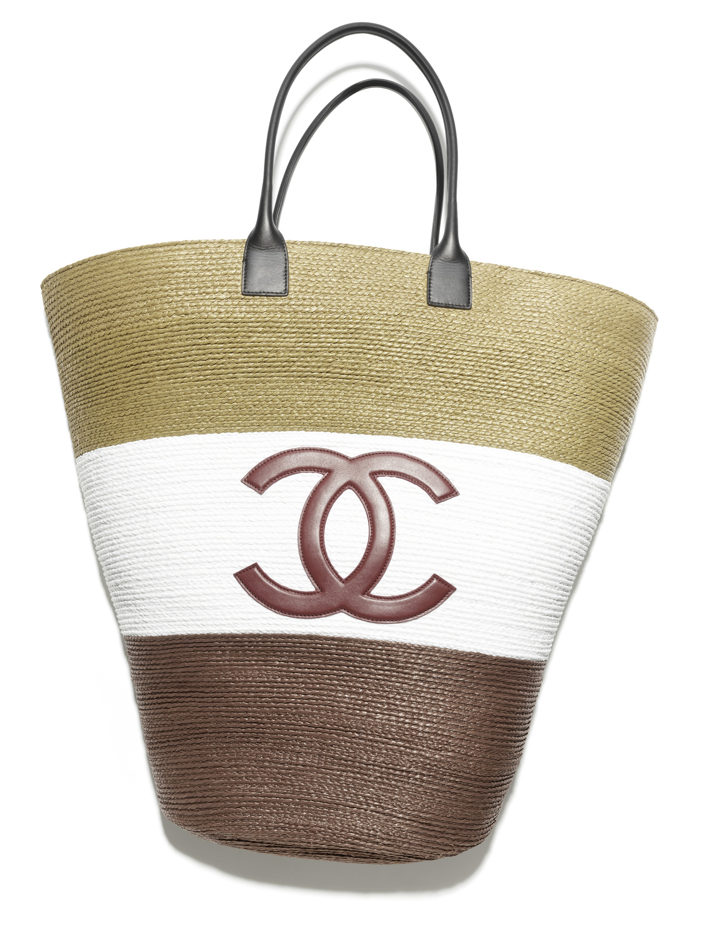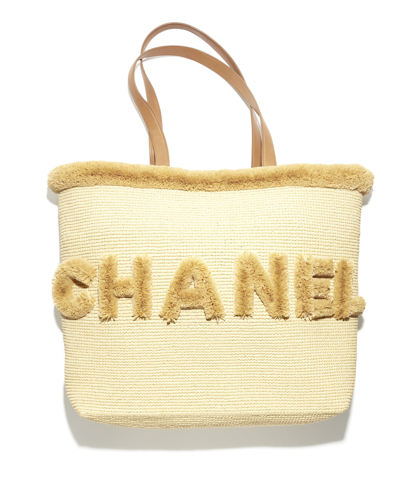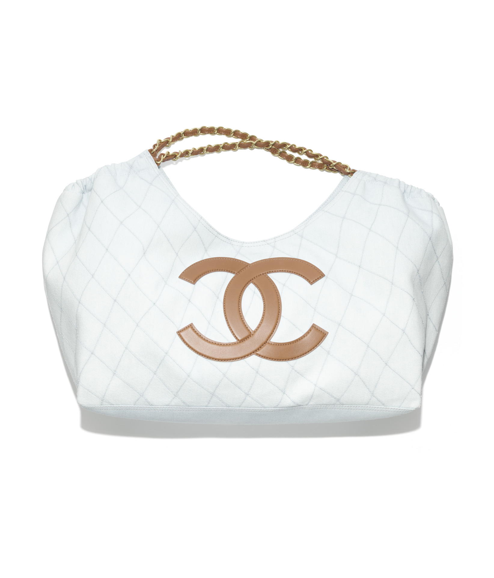米色飾以CHANEL字樣拉菲草編織肩背包;淡藍色飾以棕色雙C LOGO菱格紋丹寧肩背包