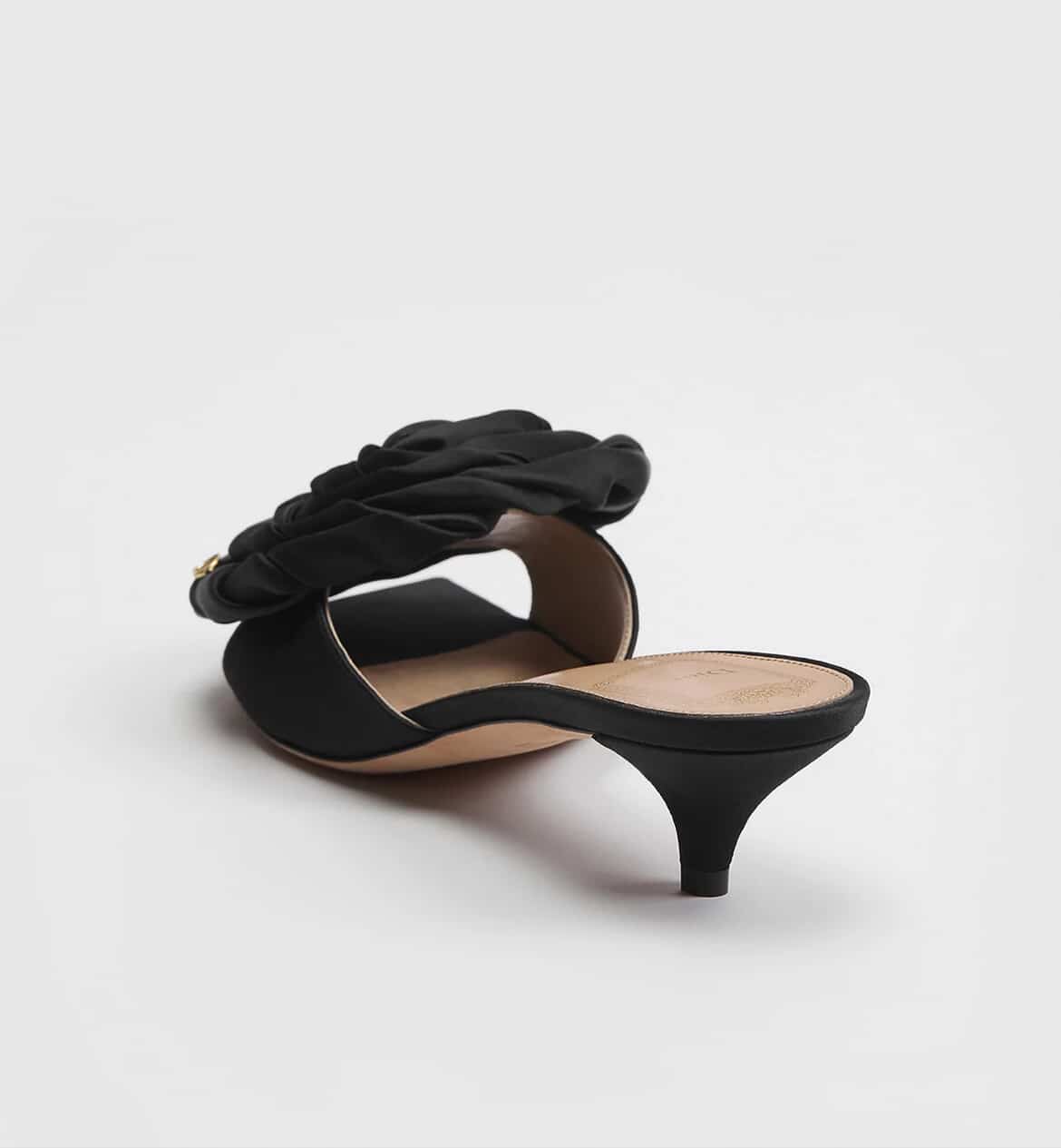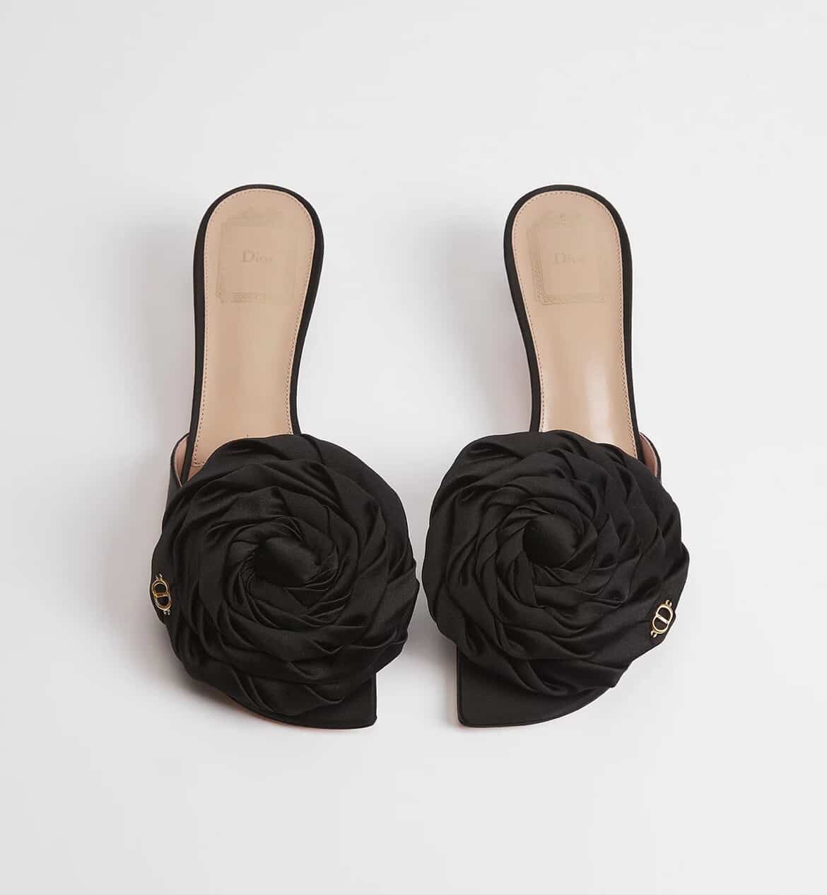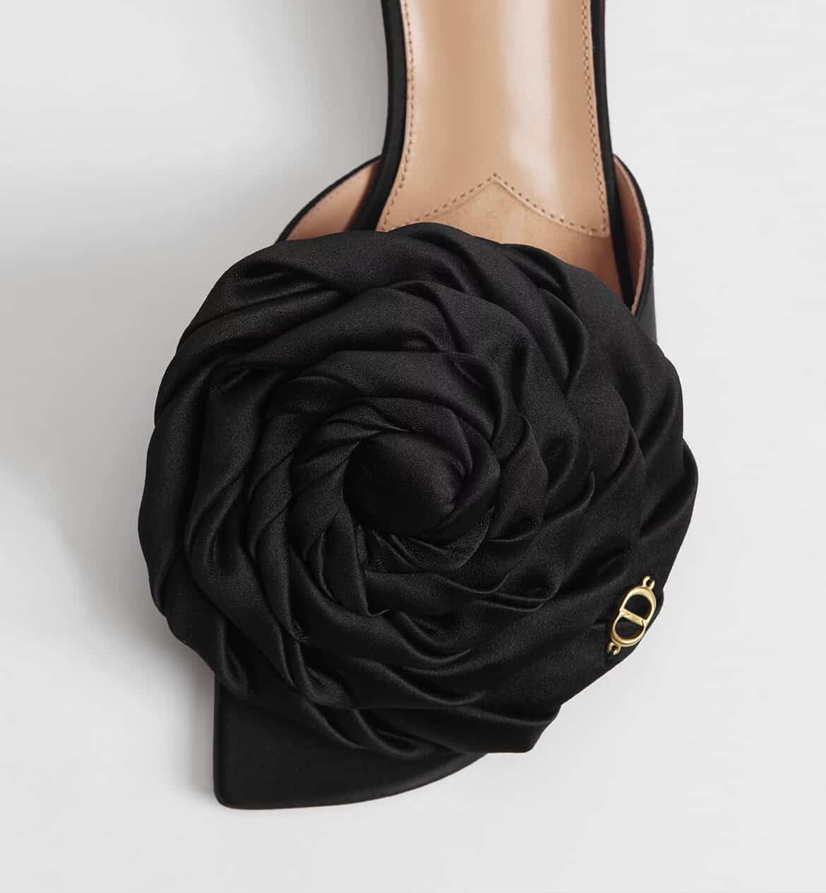 「Dior Aurore 高跟涼鞋」靈感來自製鞋大師 Roger Vivier 當年為 Dior 打造的典藏鞋款,鞋面上那一朵碩大立體的黑色緞面花簡直像是有生命般在綻放,還挺有咆哮年代的氛圍。