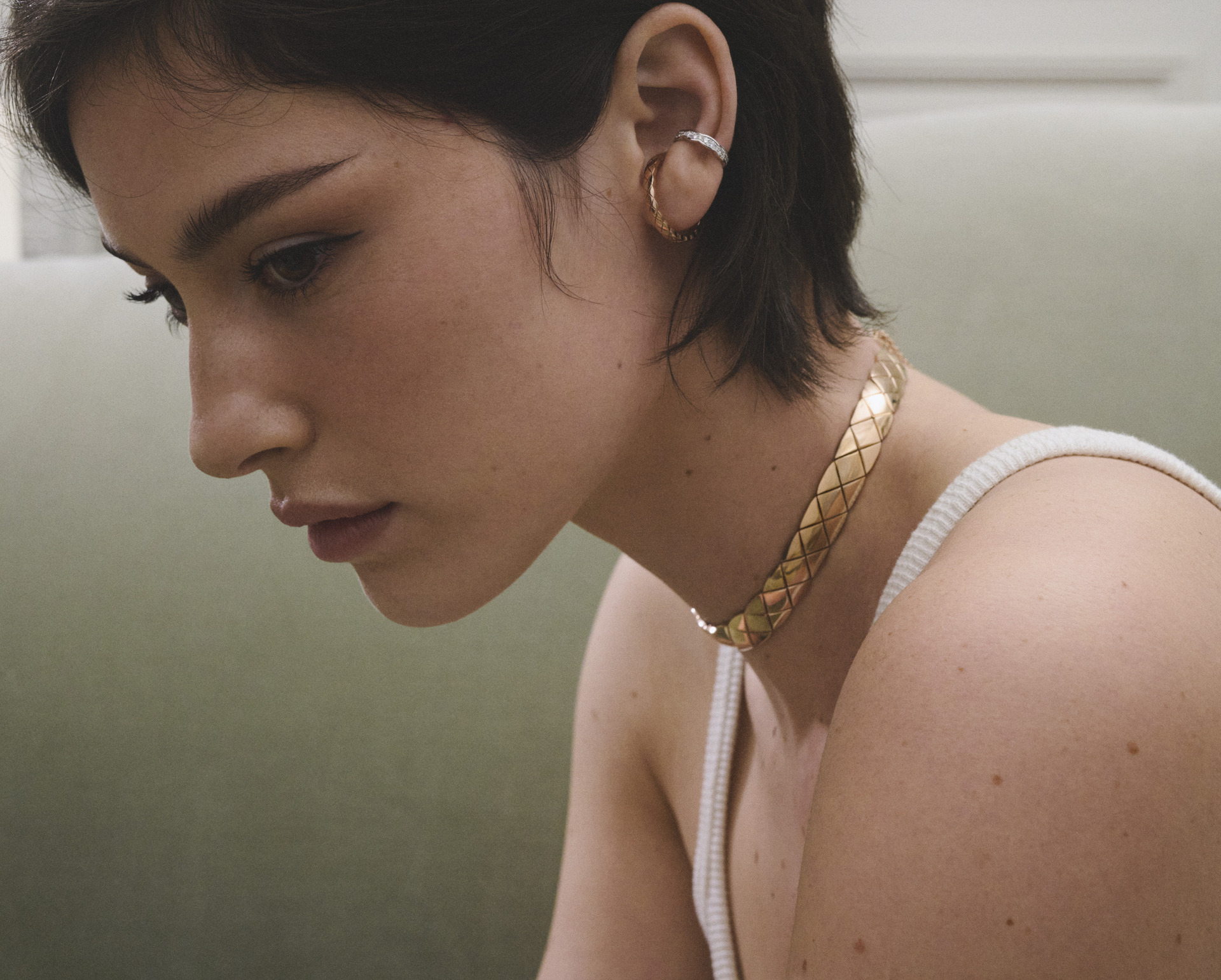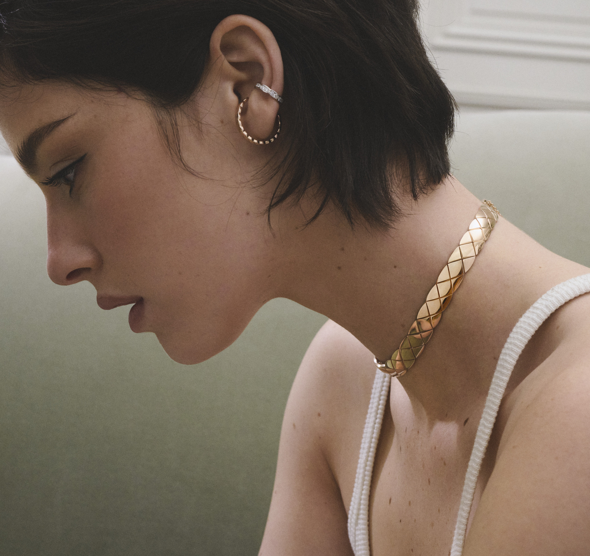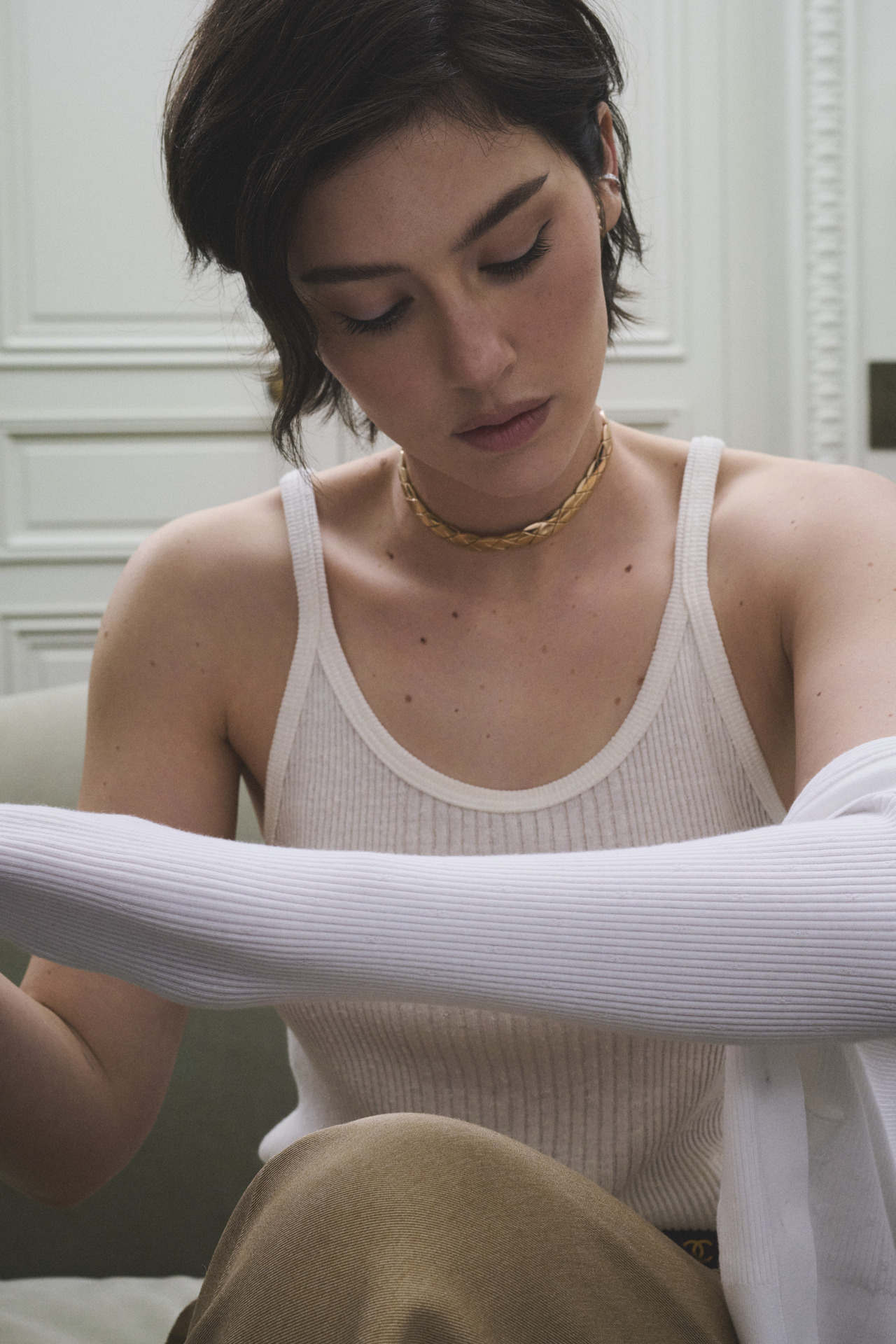 而在近日最新釋出的一組宣傳照中, Gracie Abrams 身穿白背心和灰色毛衣,再次演繹了多款 COCO CRUSH 首飾,包含兩款全新創作的柔軟短項鍊與頸鍊 ,CHANEL 經典菱格紋圖騰以網狀交織鉸接結構,俐落線條、有著完美曲線與鮮明幾何線條的設計,搭配簡單衣著就能穿出高級感。