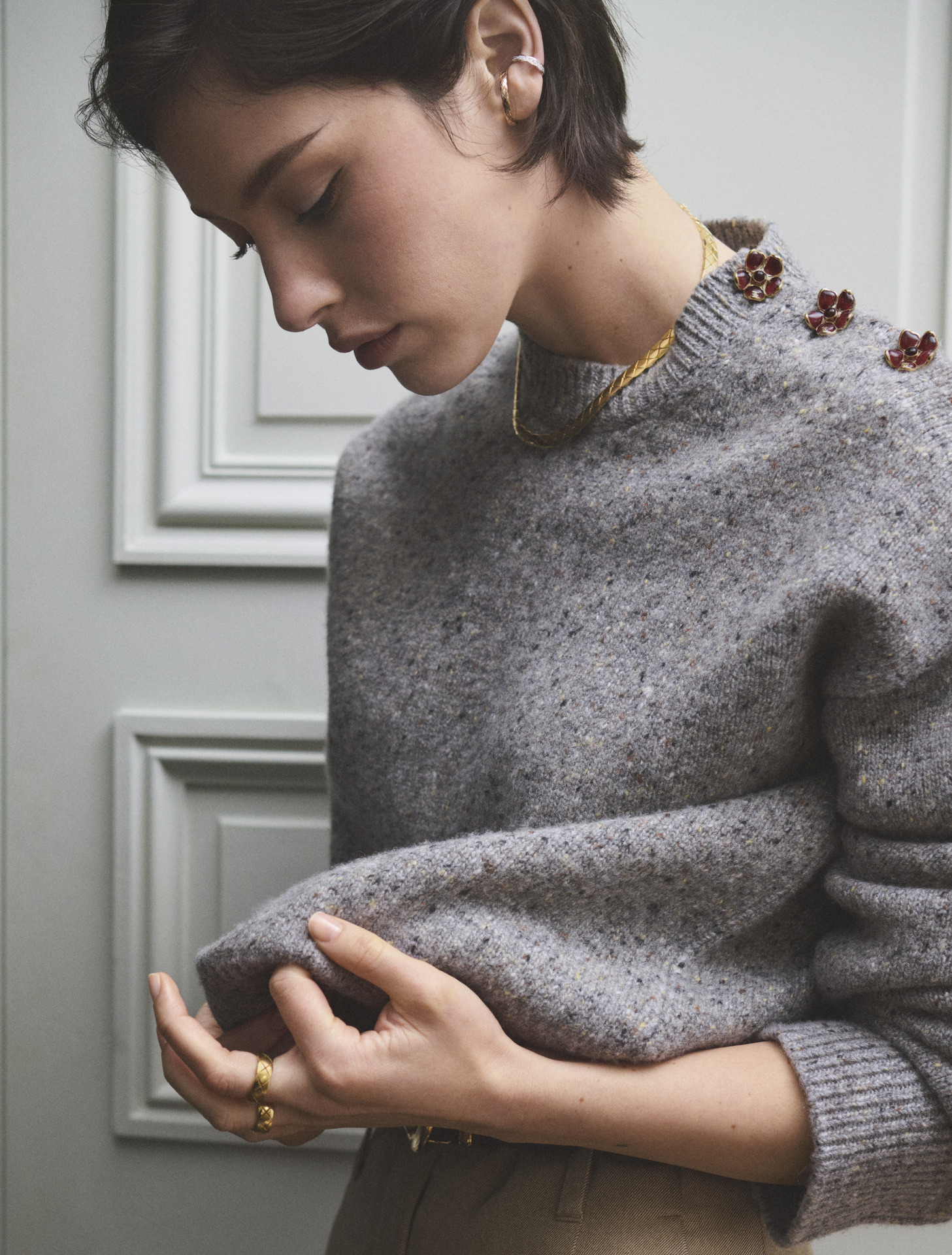 還有一月份舉行的 CHANEL COCO CRUSH 高級珠寶系列的發布活動上,Gracie Abrams 也把飾品戴得很漂亮,身穿深色毛呢上衣,搭配 COCO CRUSH 耳環與柔軟短項鍊,整個人簡約又高級。