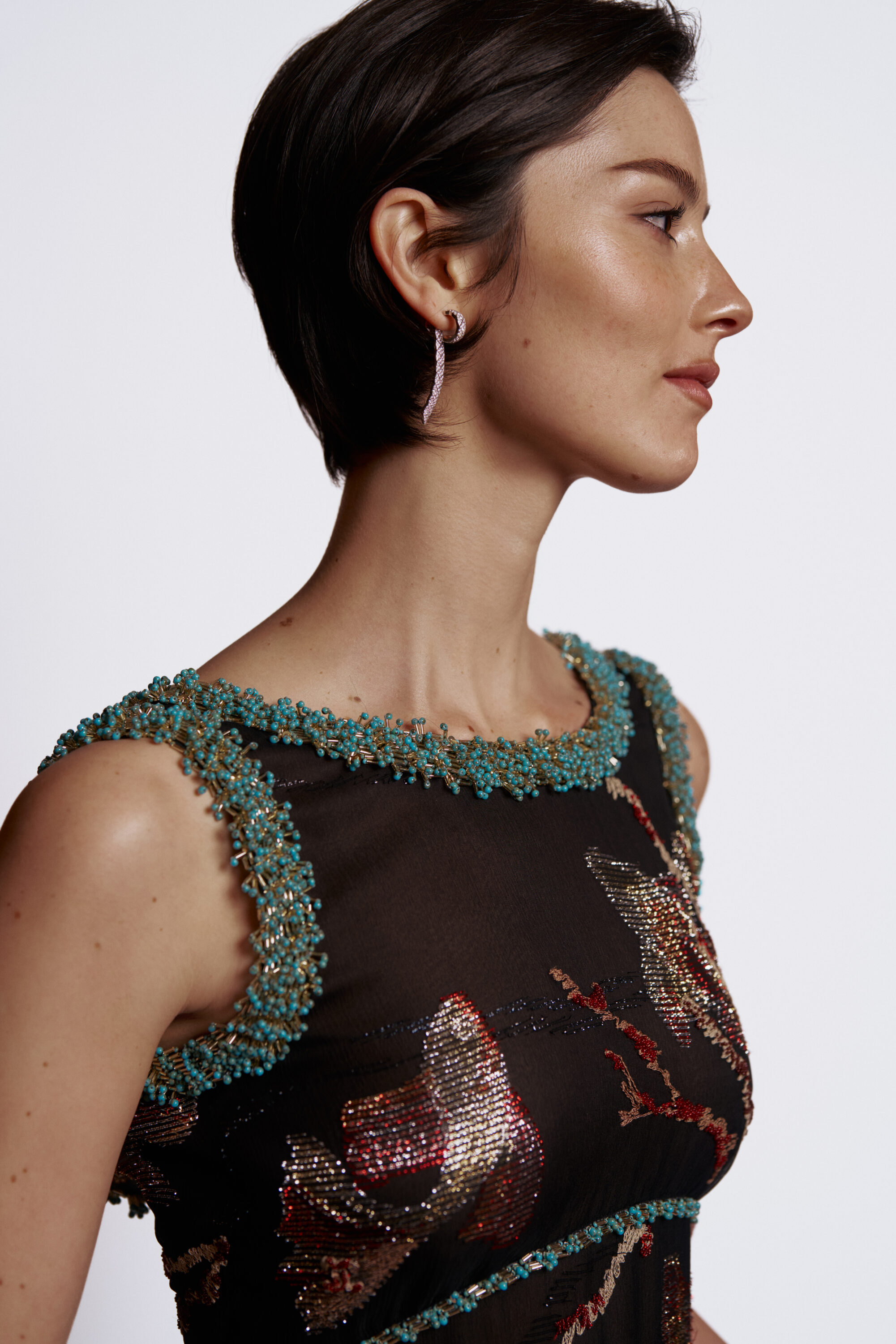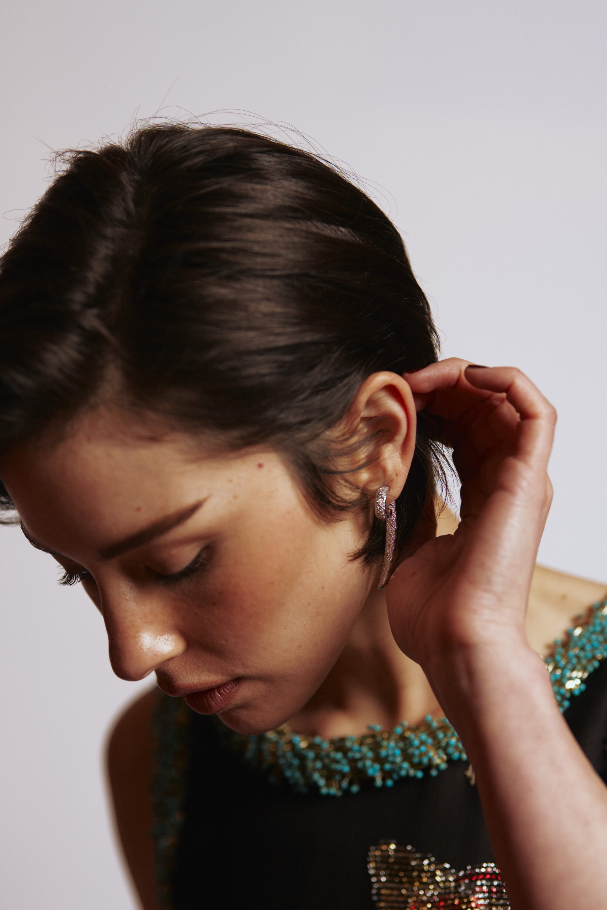 像是前陣子在英國電影學院獎(British Academy Film Awards,BAFTA)上,Gracie Abrams 身穿一襲 CHANEL 黑色刺繡與多彩絲質洋裝,將一邊頭髮勾至耳後,露出全新上市的 COCO CRUSH 柔軟可轉換式耳環。