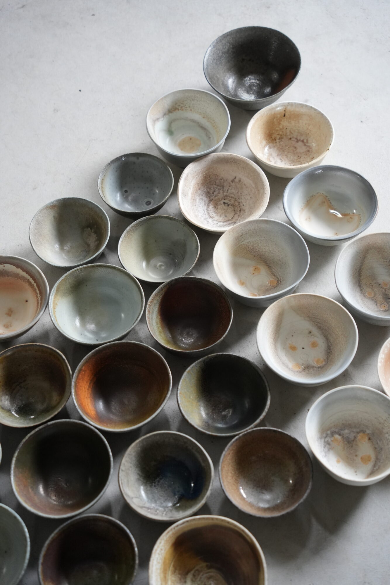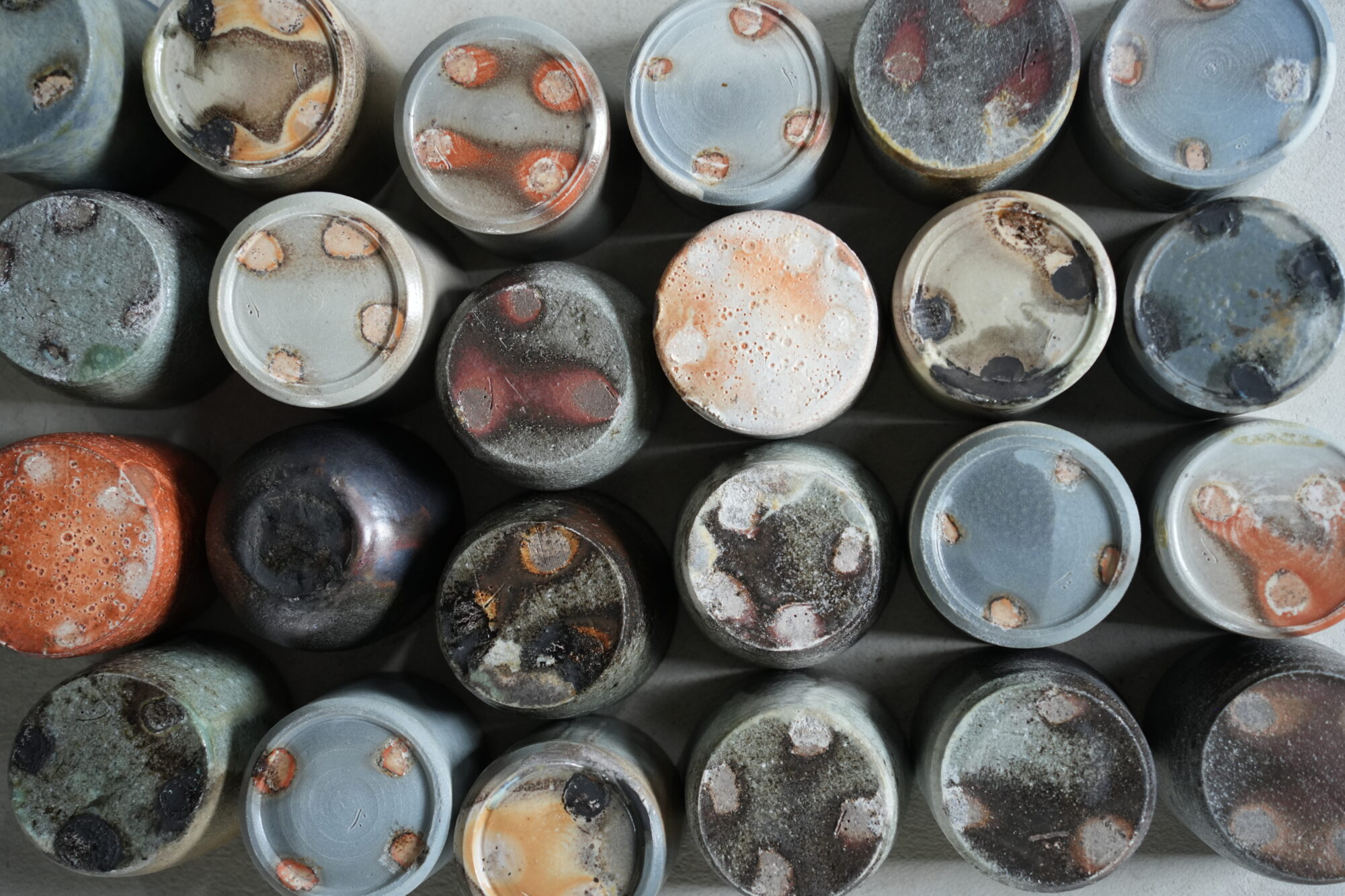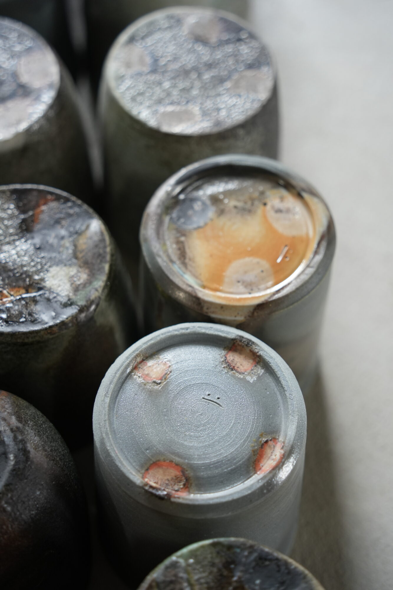 在柴燒的過程中,有些杯子明明沒有上釉,卻因為窯裡空氣的流動,意外沾染了旁邊器皿的天目釉,留下了神秘的自然結晶;有些土拉得太薄,在高溫下變了形。