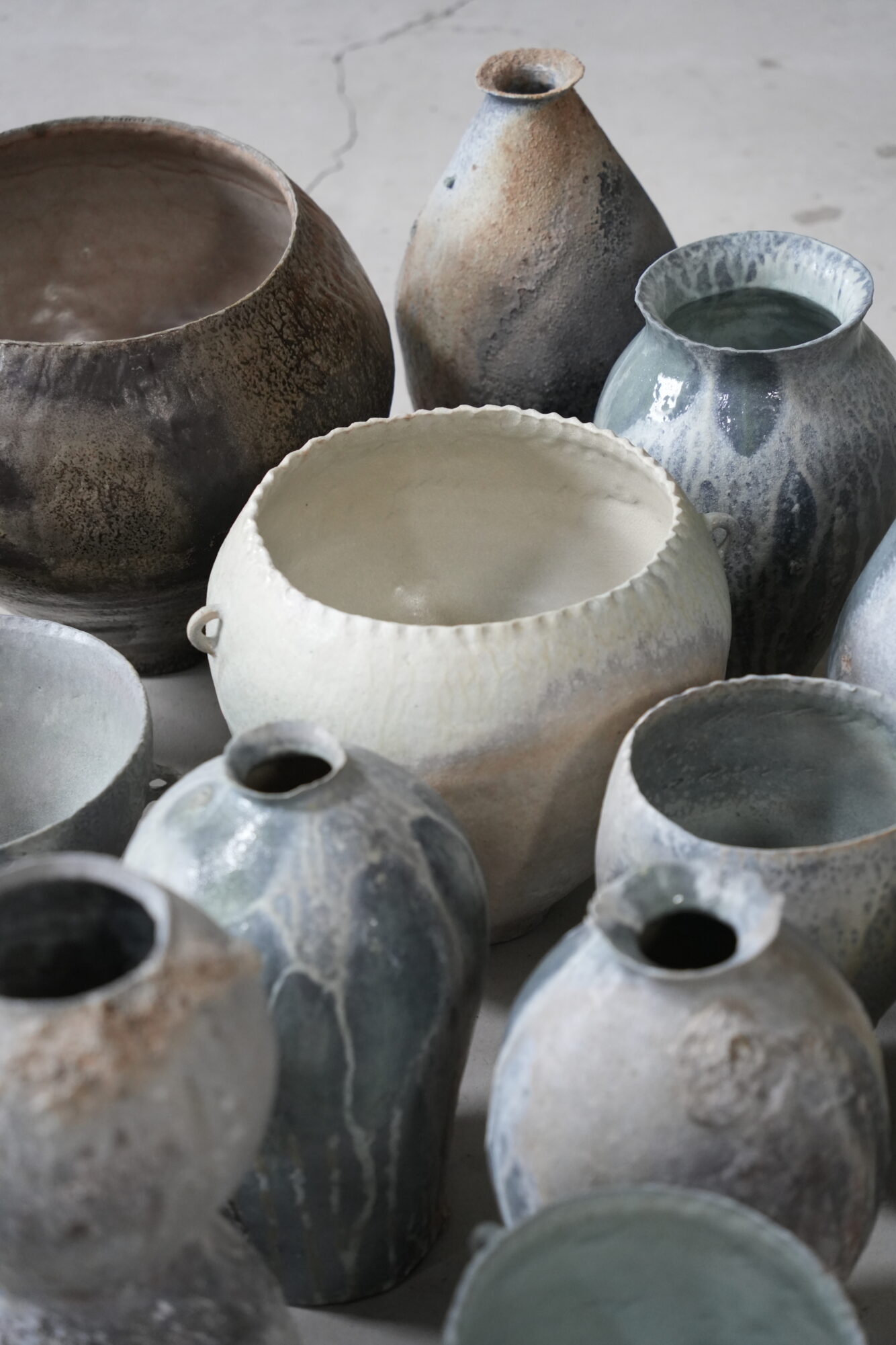 這次的創作,林嘉欣非常有實驗精神地試了九種不同陶土,包含了日本土、美國土,還有台灣在地的柴燒土與苗栗黃土。台灣的柴燒土含鐵量高,燒出來帶著溫暖的偏紅色調;而黃土則是軟糯好捏,質感很好。
