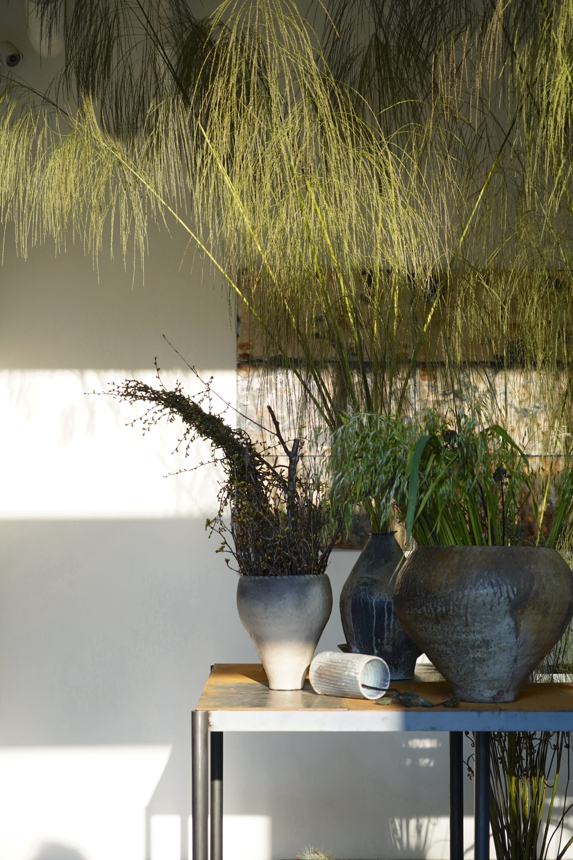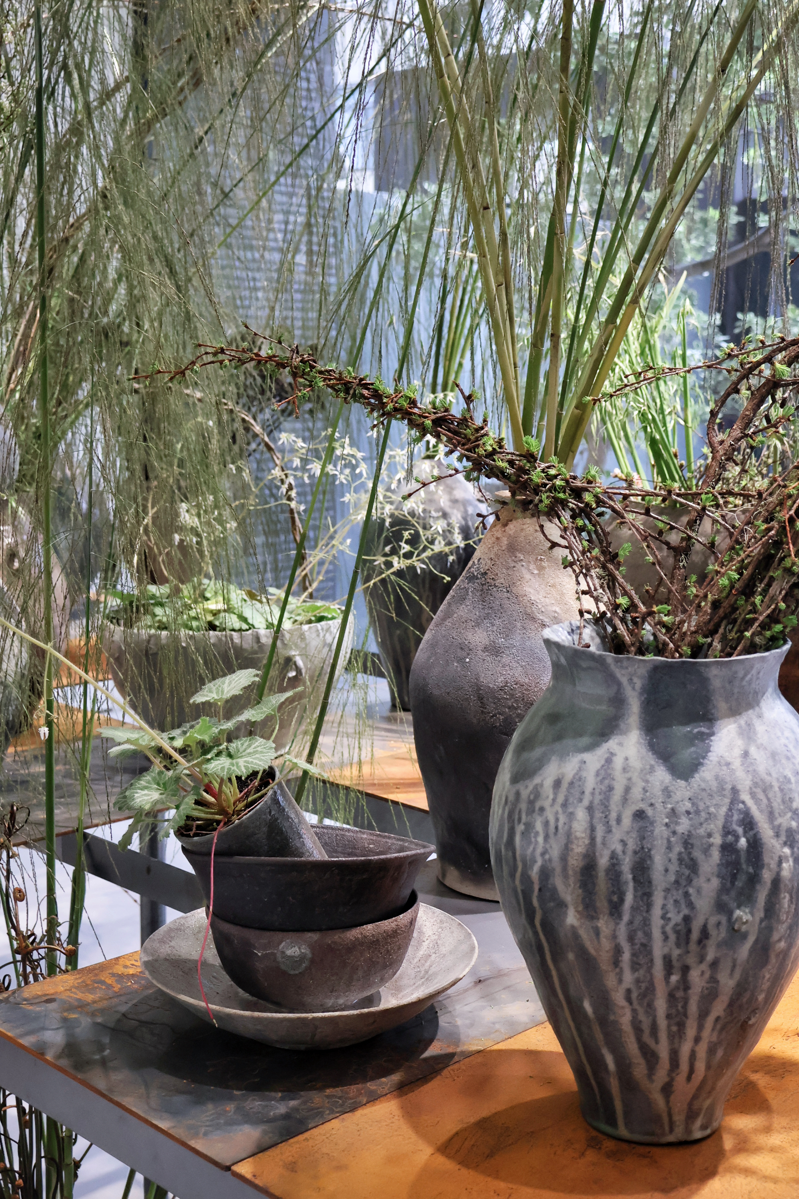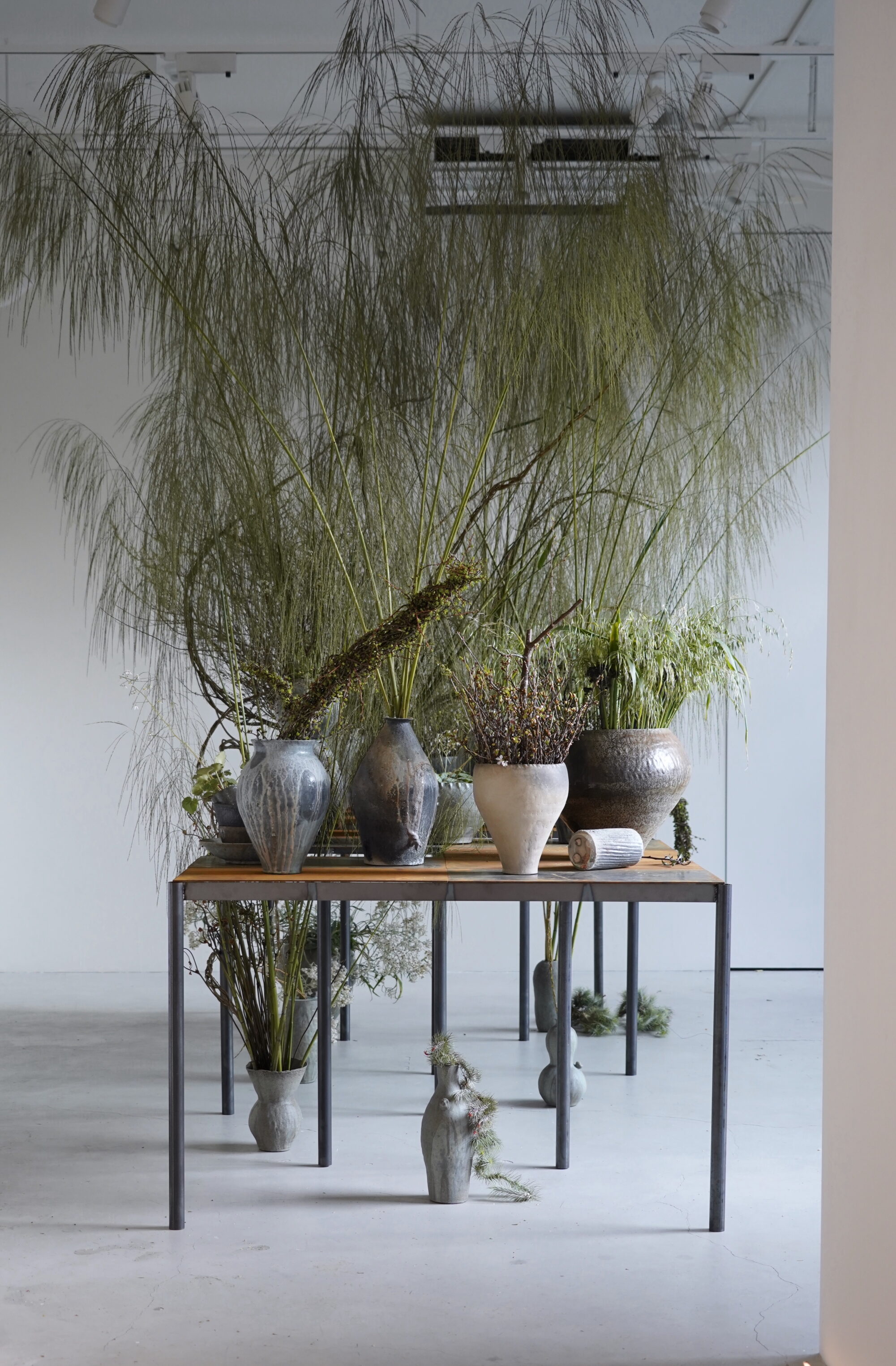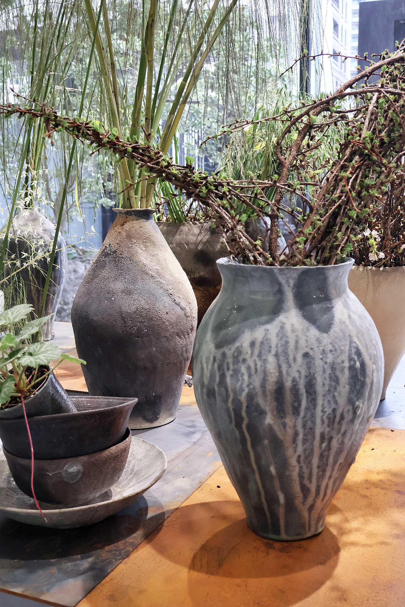 為了讓走進藝廊的人,也能感受到柴燒的生命力,這次的《餘靜》展覽,再度邀請了植物藝術家廖浩哲來操刀空間設計。