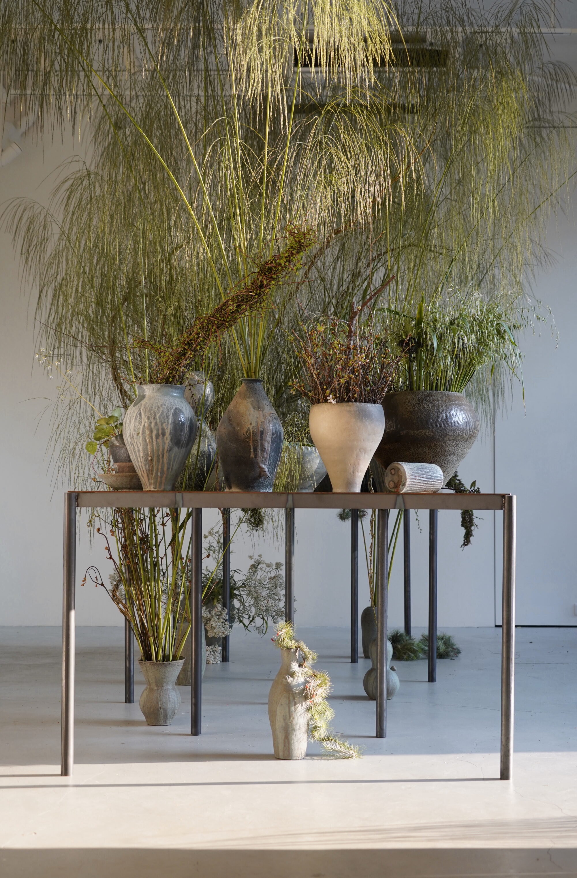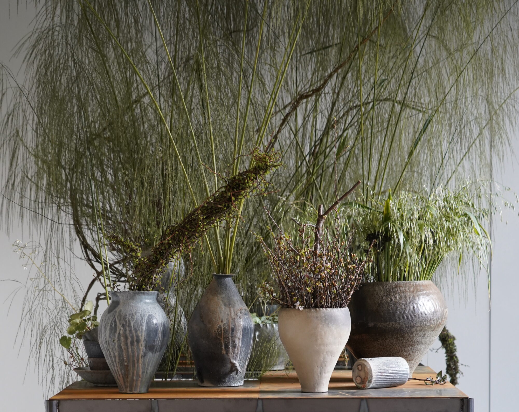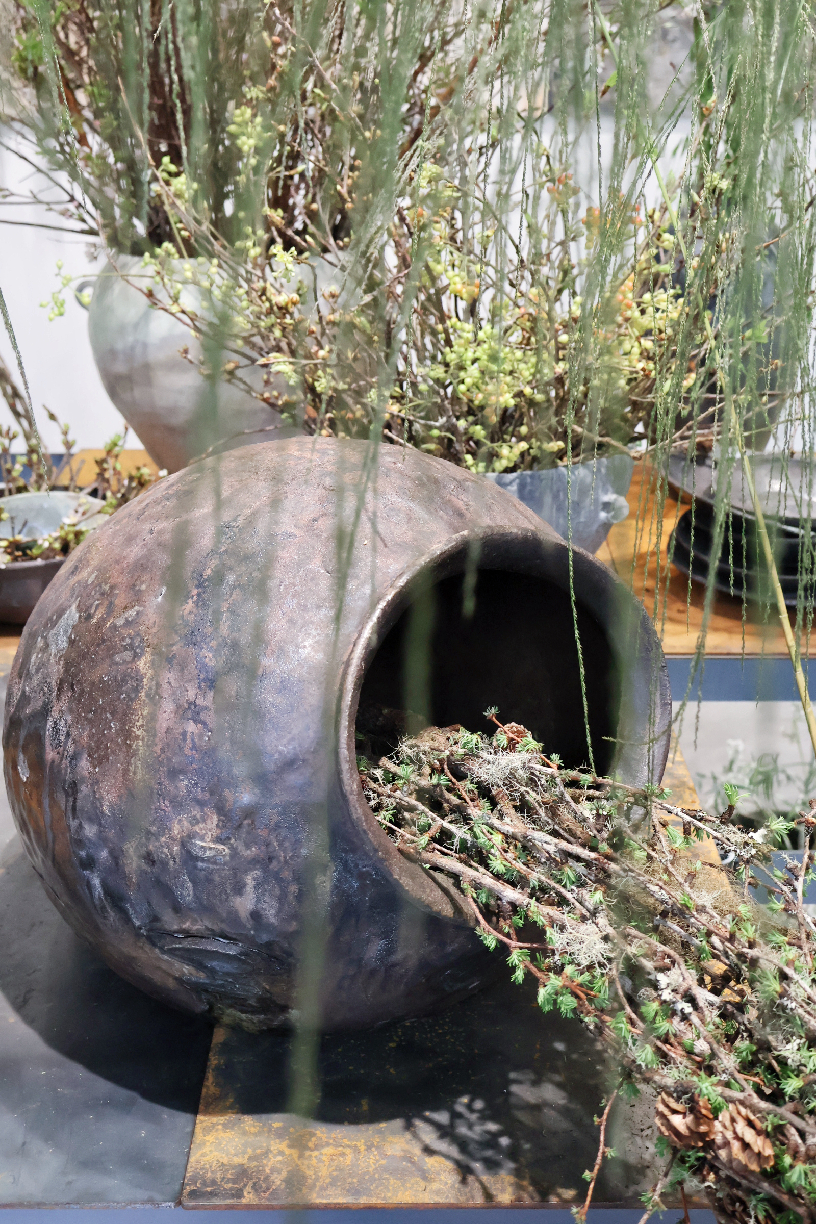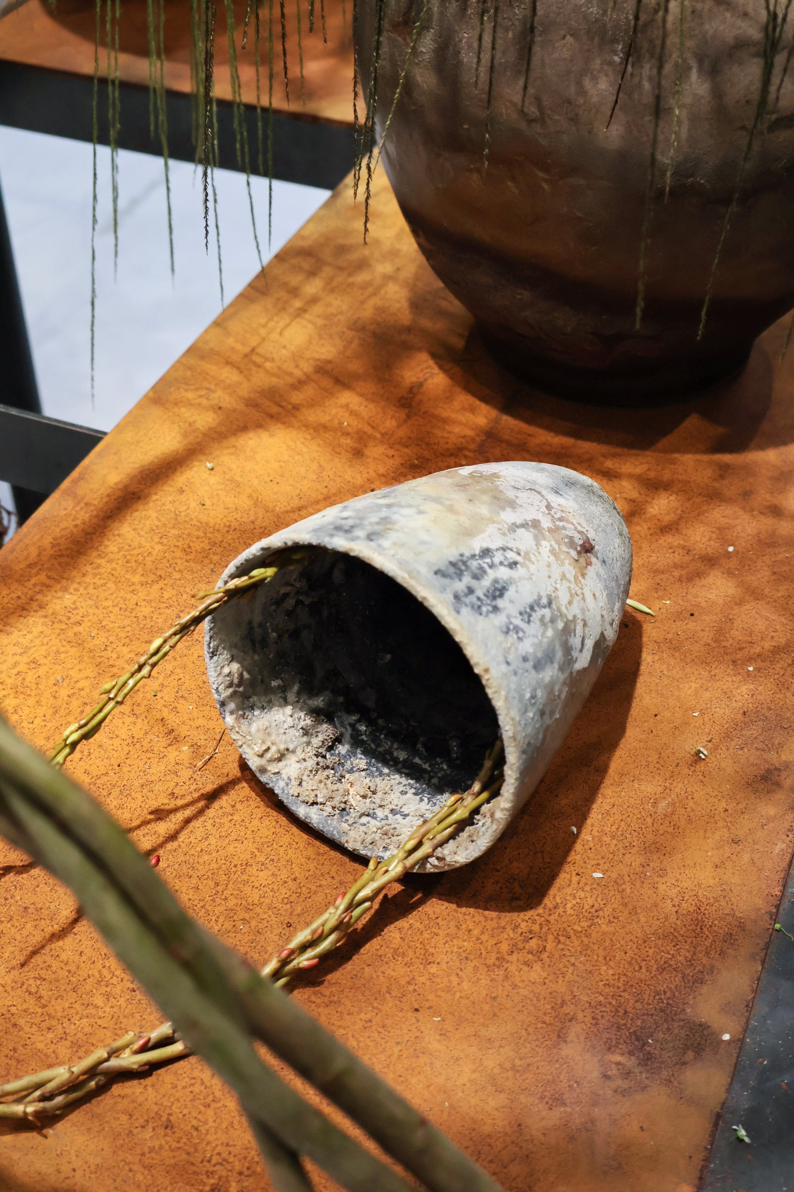 為了讓走進藝廊的人,也能感受到柴燒的生命力,這次的《餘靜》展覽,再度邀請了植物藝術家廖浩哲來操刀空間設計。