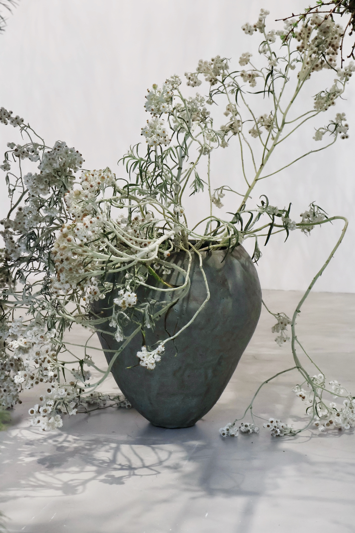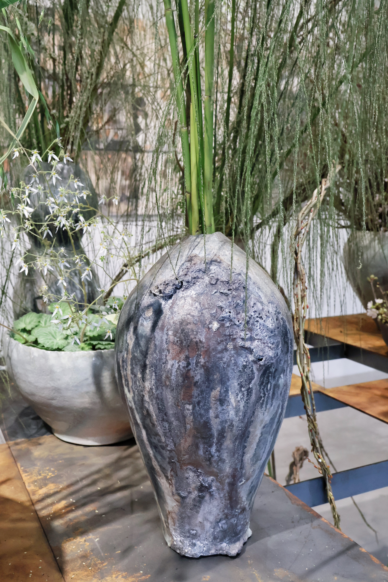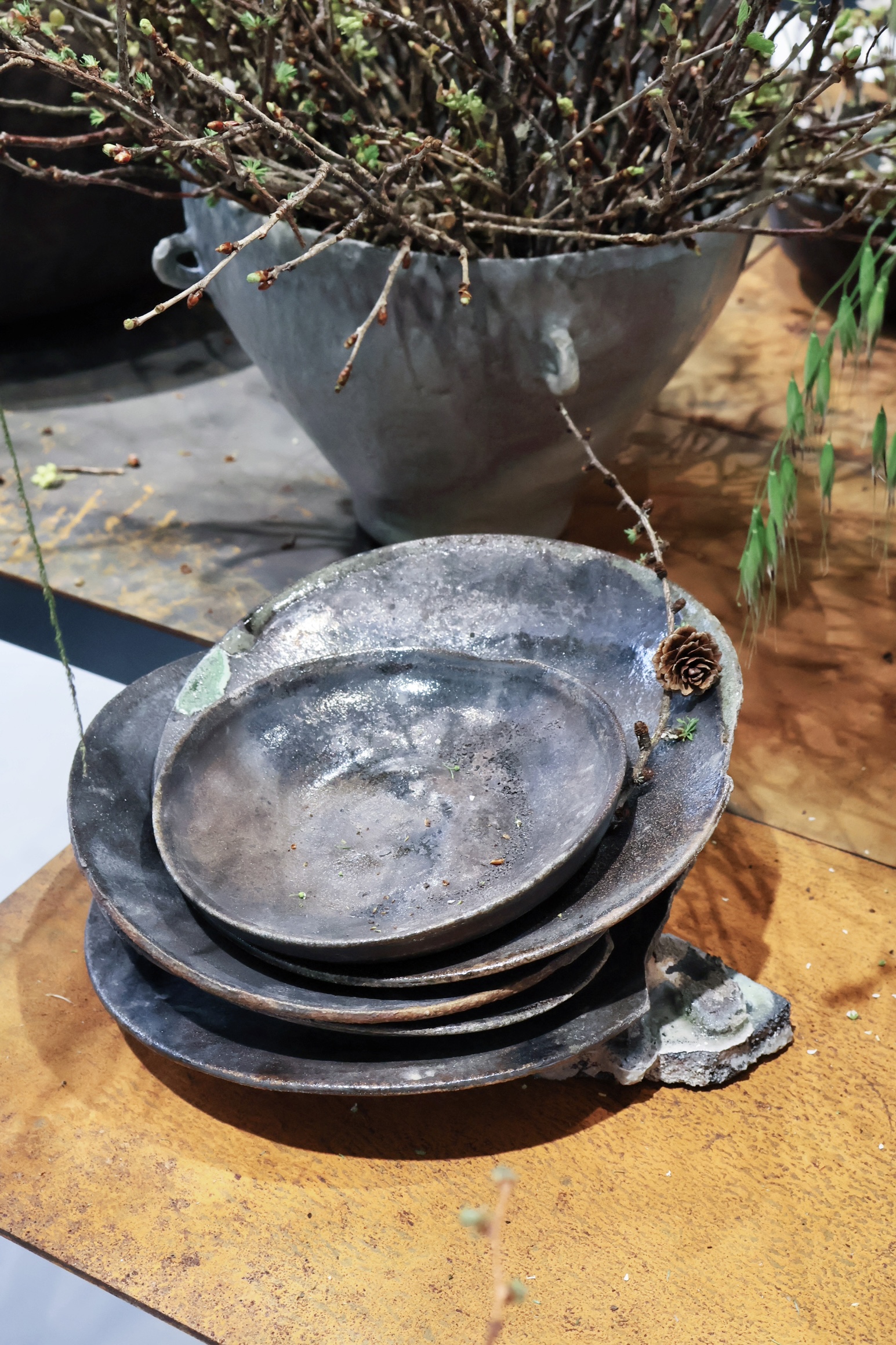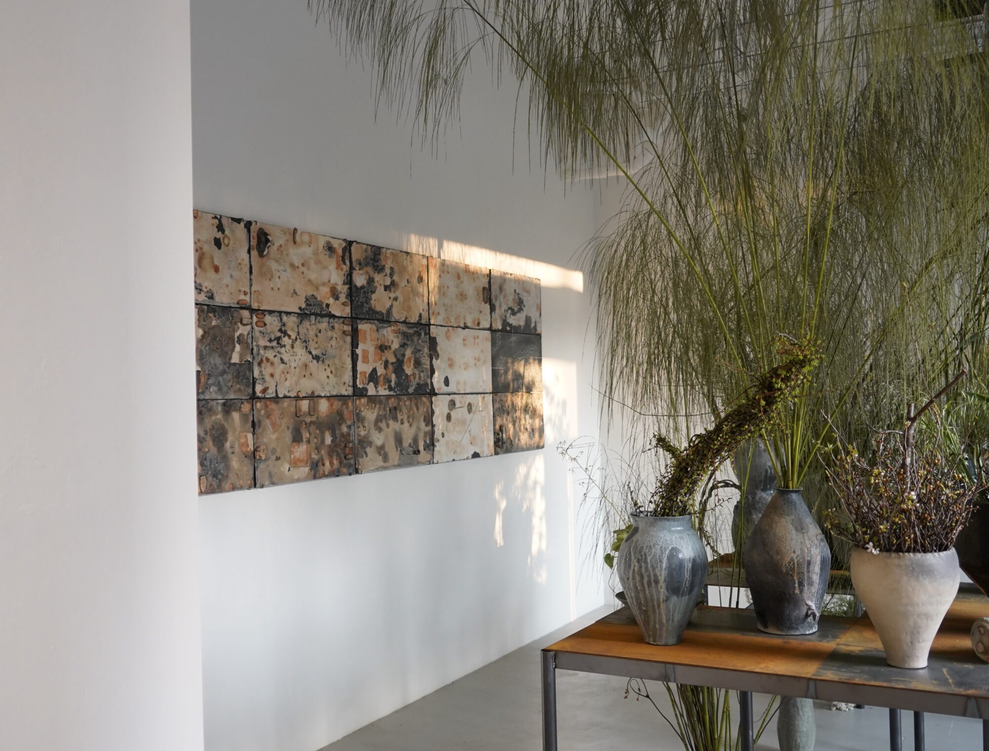 為了讓走進藝廊的人,也能感受到柴燒的生命力,這次的《餘靜》展覽,再度邀請了植物藝術家廖浩哲來操刀空間設計。