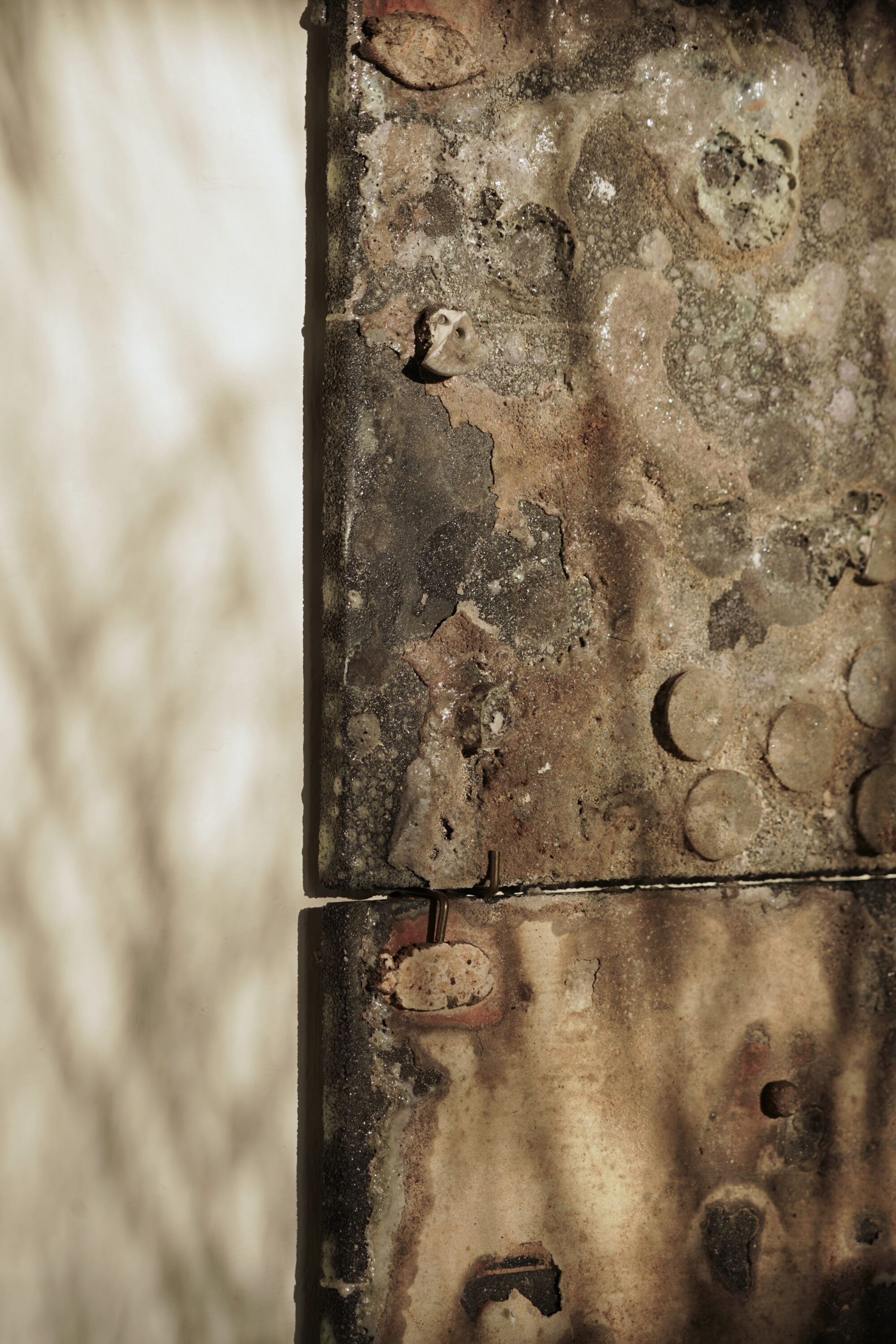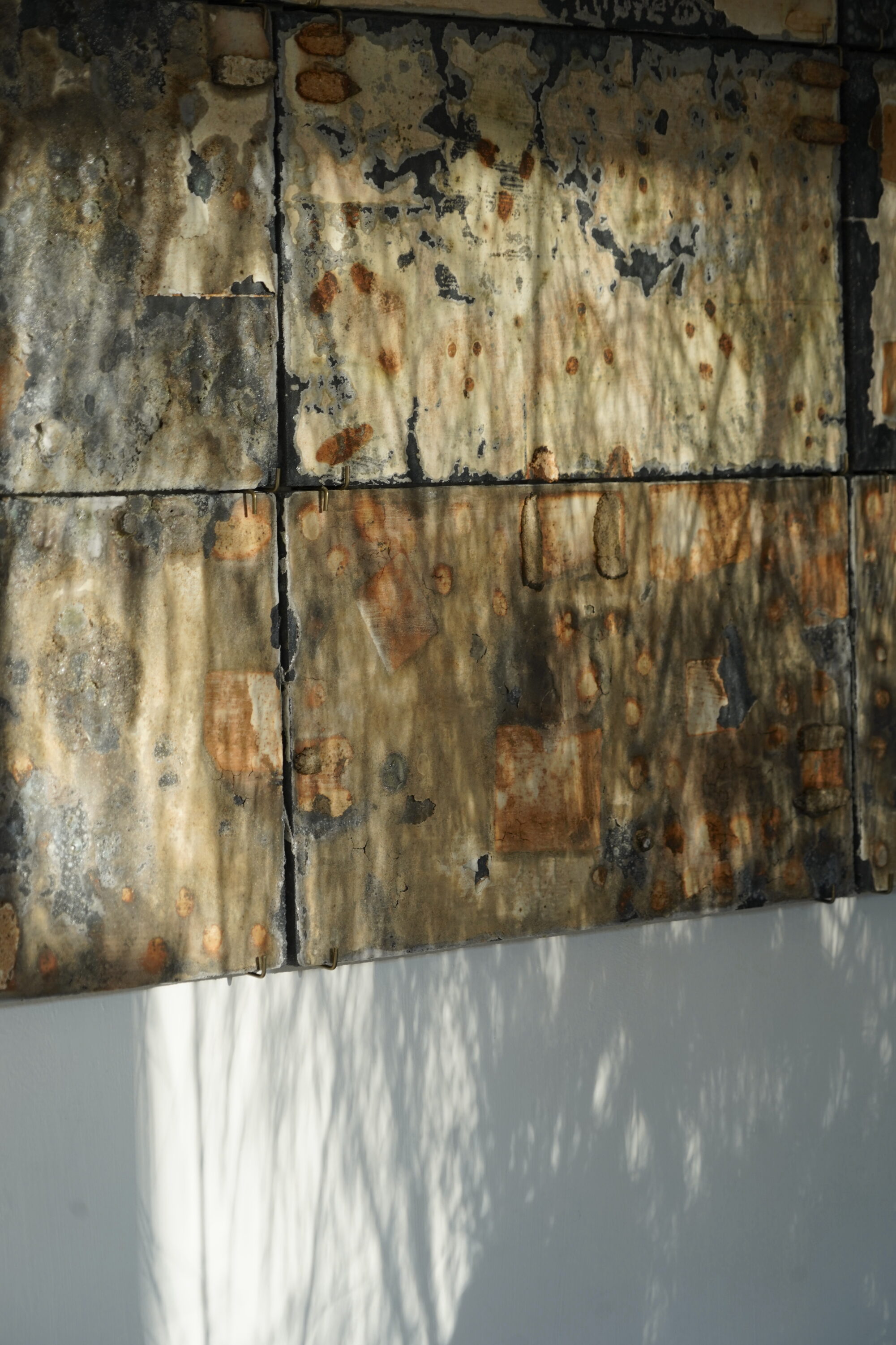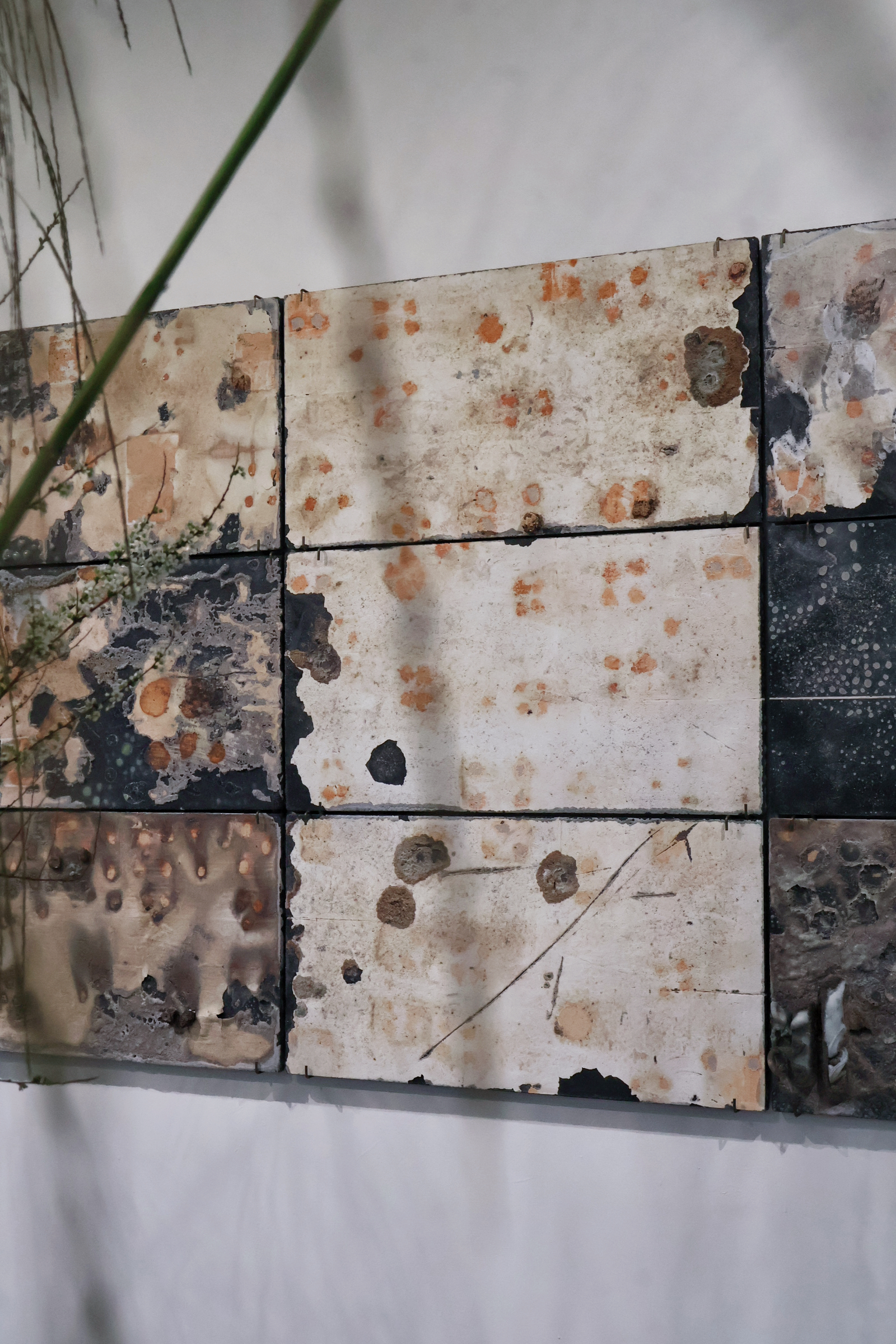 展場裡還陳列了充滿鐵鏽感的投柴鐵架,還有燒窯時用來墊作品的「耐火棚板」,林嘉欣特別跟陶藝中心借來了這些棚板,上面清晰可見高溫熔化在一起的鈕扣、自然滴落的釉藥,還有測溫用的耐火磚痕跡,忠實紀錄了火影舞動的模樣,像是真的把玉井的風景,連同自由的空氣,搬進了純 Object 空間裡。