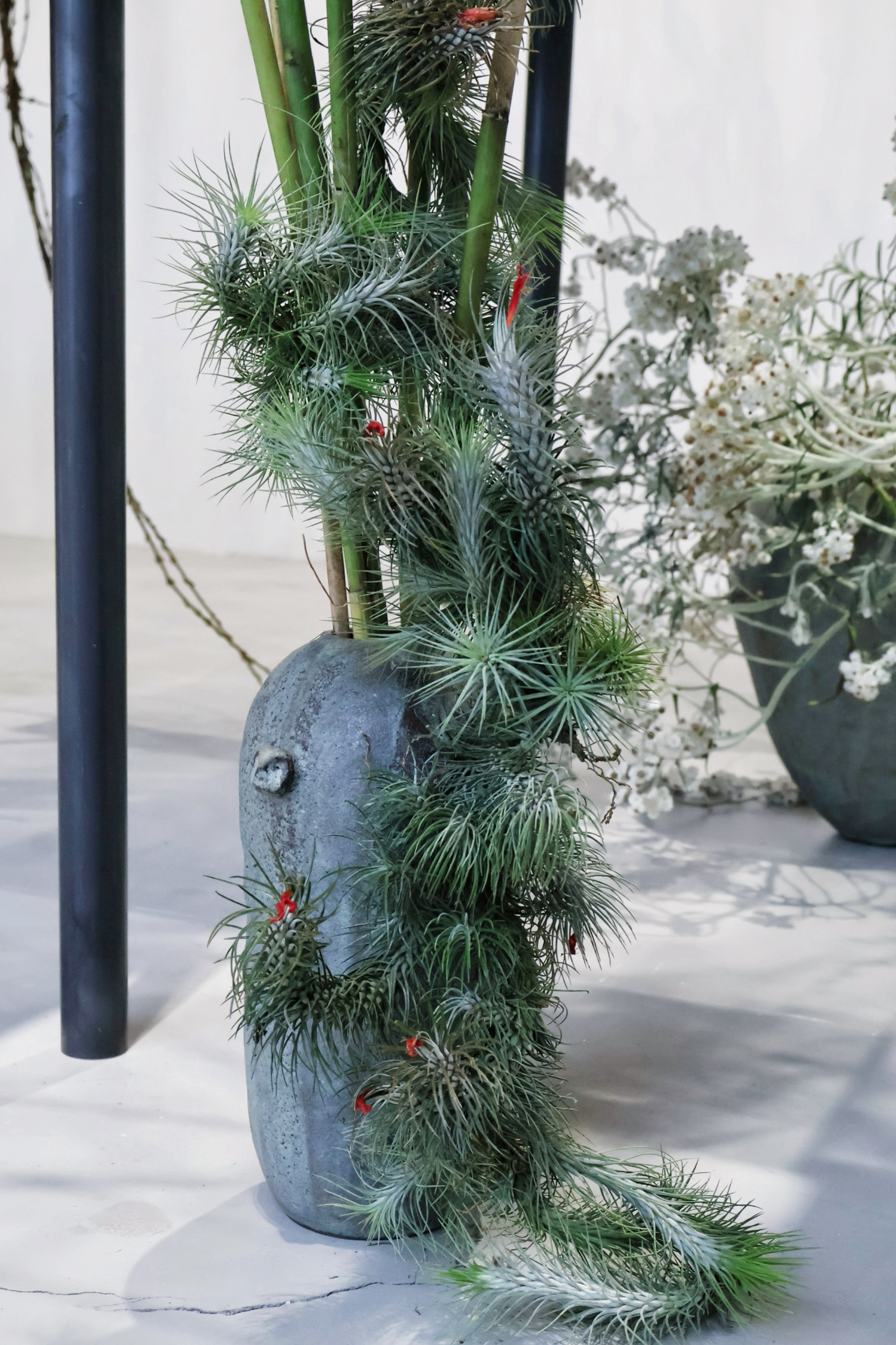 廖浩哲親自走訪了台南玉井後,決定把當地的靈魂帶進台北,他用了蘆葦、燕麥、細毛等台灣野生植物,搭配林嘉欣很喜歡的、帶有霧感氛圍的空氣草,用編織的手法讓植物像一條生命線般穿梭在陶瓷、桌面與地下,呈現萬物皆有連結的呼吸感。