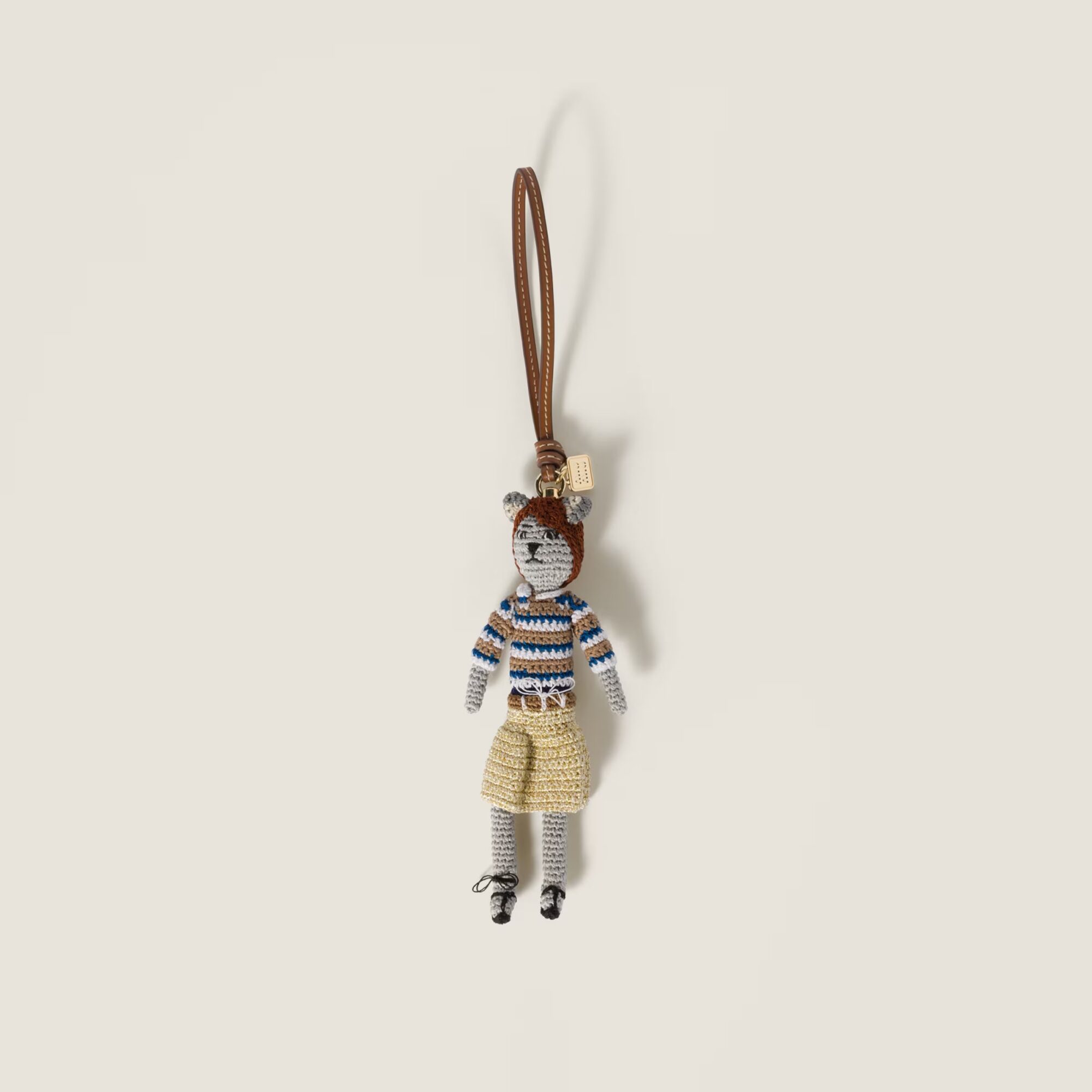 鉤針娃娃也上了新款,穿上一整套 Miu Miu 經典造型,像是印花短裙、蓬蓬裙、條紋上衣,還搭配可愛的針織帽、長筒襪等等,作為包款上的小型配件不僅俏皮可愛又好精緻。